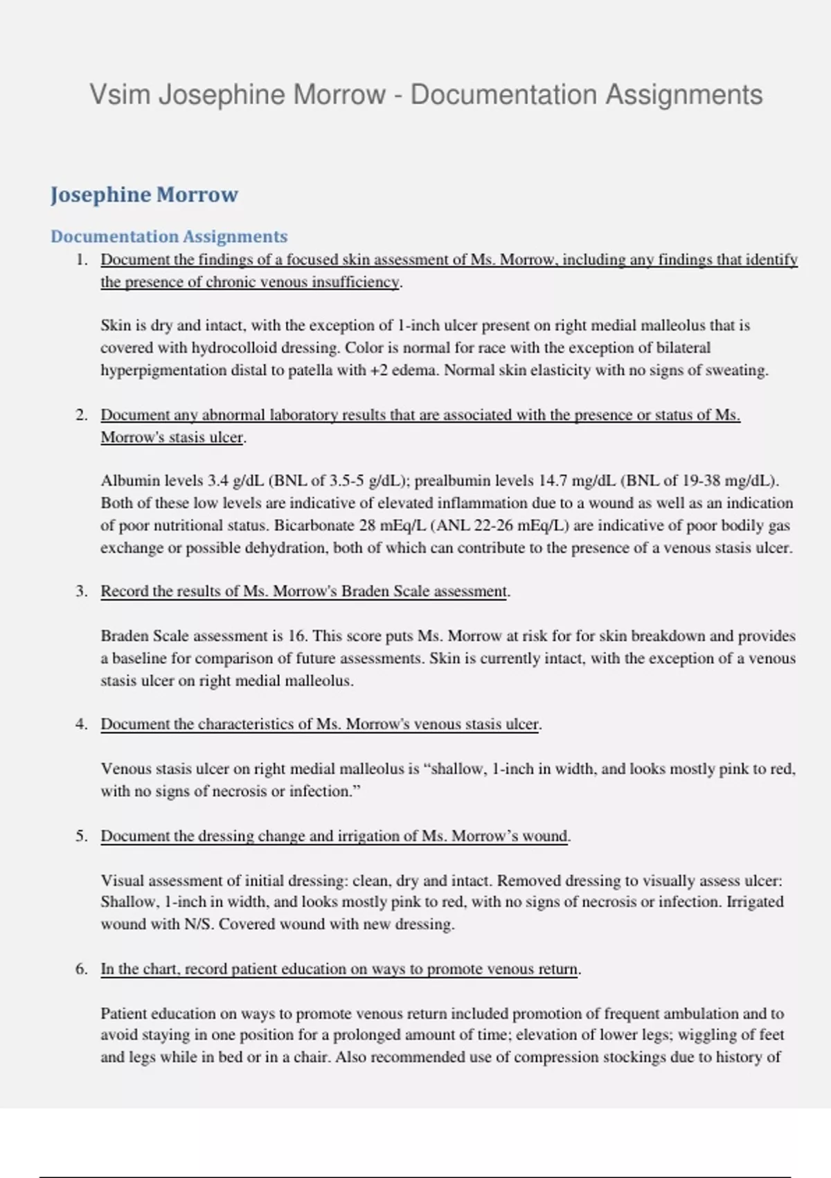 1. Document the findings of a focused skin assessment of Ms. Morrow, including any findings that identify