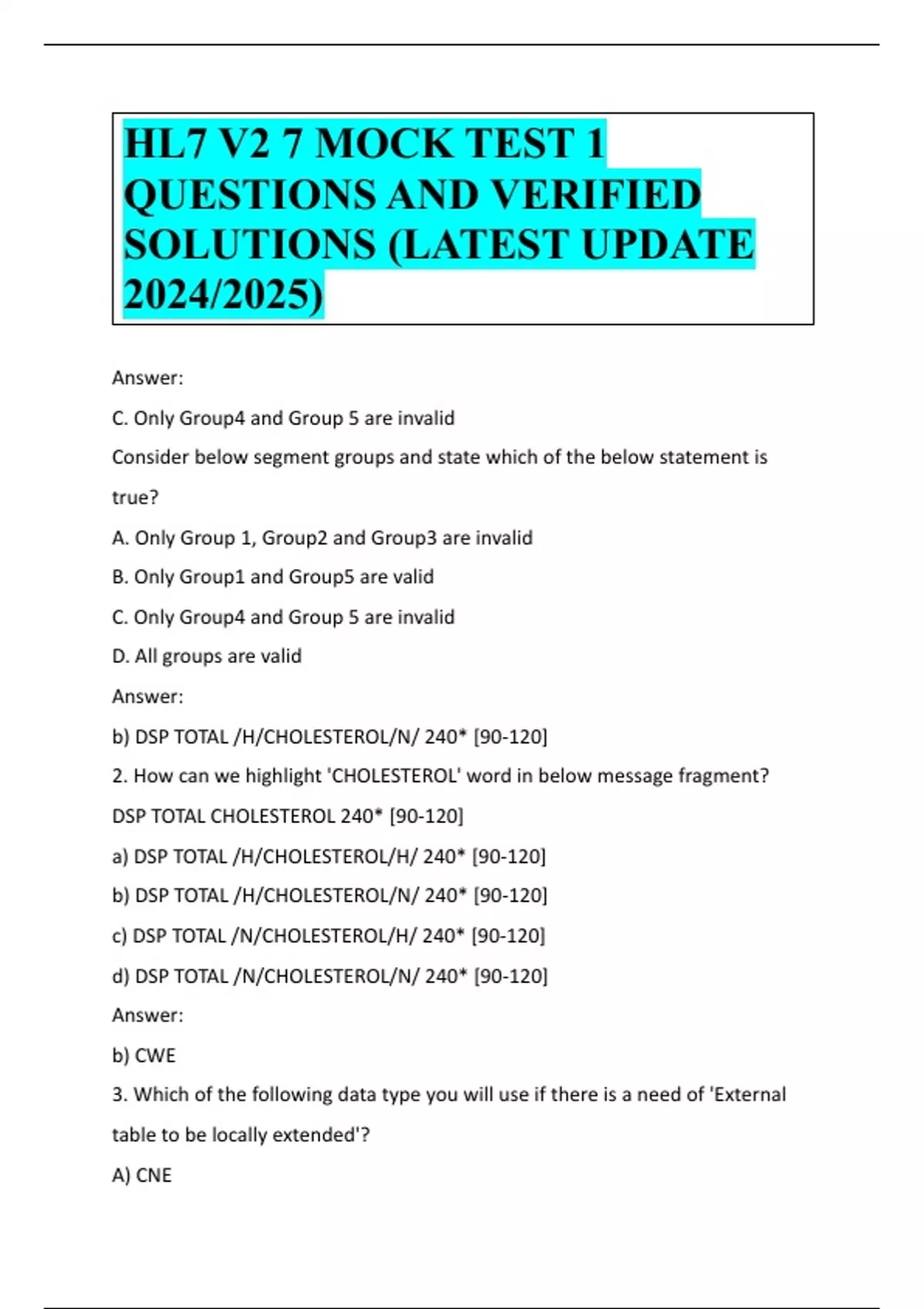 HL7 V2 7 MOCK TEST 1 QUESTIONS AND VERIFIED SOLUTIONS (LATEST UPDATE 2024/2025)