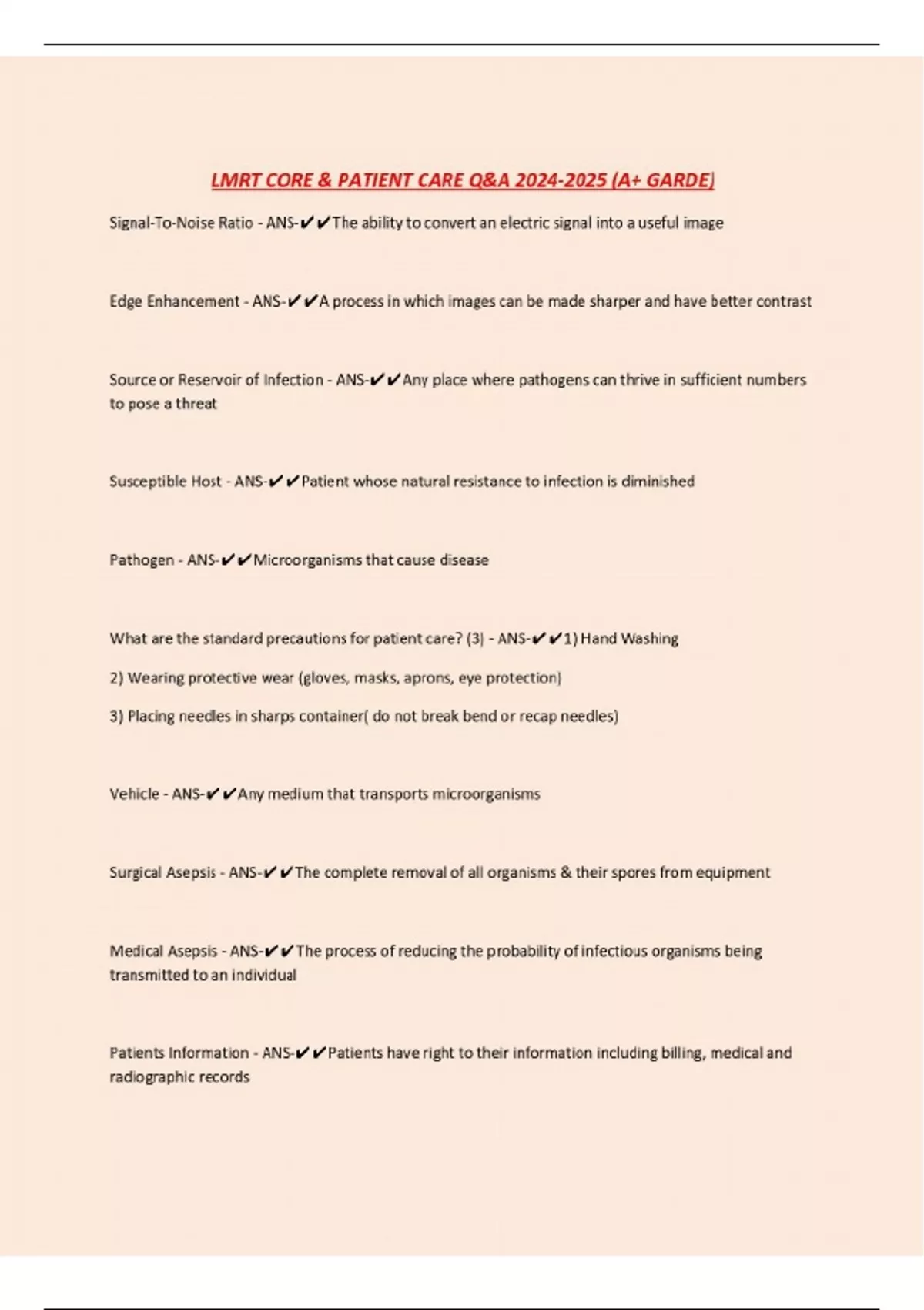 LMRT CORE & PATIENT CARE Q&A (A+ GARDE) Signal-To-Noise Ratio - ANS-The ability to convert an electric signal into a useful image Edge Enhancement - ANS-A process in which images can be made sharper and have better contrast Source or Reservoir of Infection - ANS-Any place where pathogens can thrive in sufficient numbers to pose a threat Susceptible Host - ANS-Patient whose natural resistance to infection is diminished Pathogen - ANS-Microorganisms that cause disease What are the standard precautions for patient care? (3) - ANS-1) Hand Washing 2) Wearing protective wear (gloves, masks, aprons, eye protection) 3) Placing needles in sharps container( do not break bend or recap needles) Vehicle - ANS-Any medium that transports microorganisms Surgical Asepsis - ANS-The complete removal of all organisms & their spores from equipment Medical Asepsis - ANS-The process of reducing the probability of infectious organisms being transmitted to an individual Patients Information - ANS-
