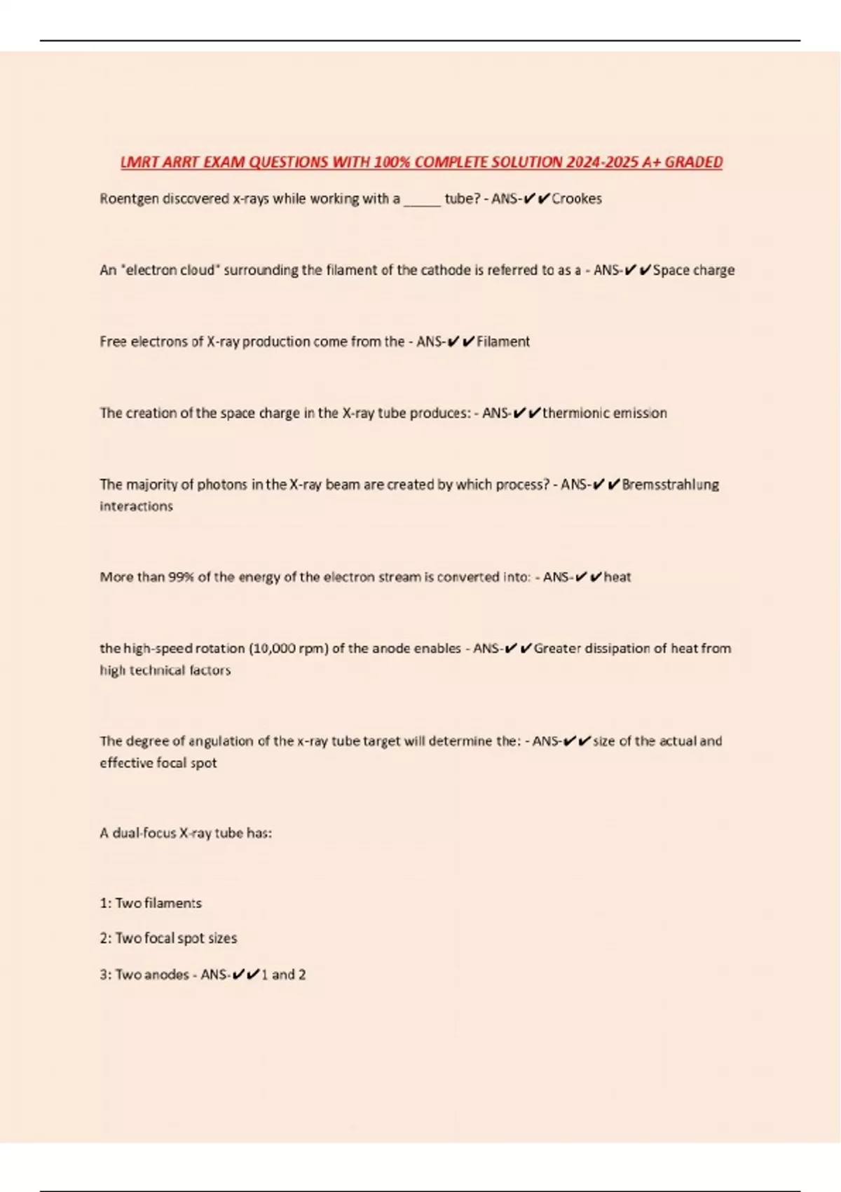 LMRT ARRT EXAM QUESTIONS WITH 100% COMPLETE SOLUTION A+ GRADED Roentgen discovered x-rays while working with a _____ tube? - ANS-Crookes An "electron cloud" surrounding the filament of the cathode is referred to as a - ANS-Space charge Free electrons of X-ray production come from the - ANS-Filament The creation of the space charge in the X-ray tube produces: - ANS-thermionic emission The majority of photons in the X-ray beam are created by which process? - ANS-Bremsstrahlung interactions More than 99% of the energy of the electron stream is converted into: - ANS-heat the high-speed rotation (10,000 rpm) of the anode enables - ANS-Greater dissipation of heat from high technical factors The degree of angulation of the x-ray tube target will determine the: - ANS-size of the actual and effective focal spot A dual-focus X-ray tube has: 1: Two filaments 2: Two focal spot sizes 3: Two anodes - ANS-1 and 2 The anode heel effect is a phenomenon of X-ray production that results in: - ANS-Uneven distribution of radiation within the x-ray field The penetrating power of the X-ray beam is controlled by varying the - ANS... Continues...