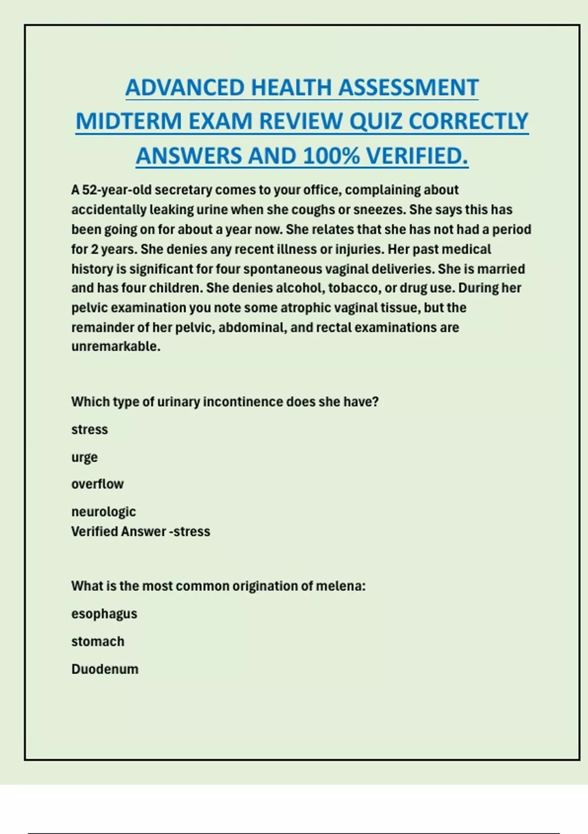 ADVANCED HEALTH ASSESSMENT MIDTERM EXAM REVIEW QUIZ CORRECTLY ANSWERS AND 100% VERIFIED.