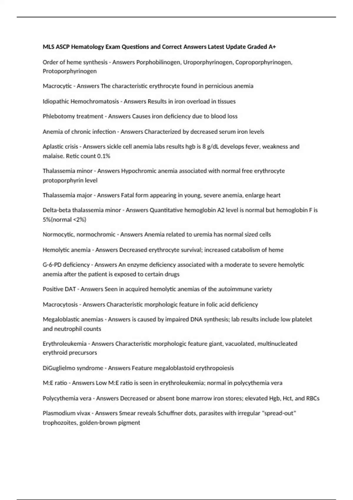 Hemolytic anemia - Answers Decreased erythrocyte survival; increased catabolism of heme