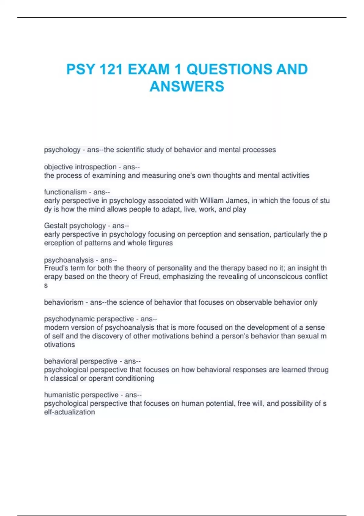 PSY 121 EXAM 1 QUESTIONS AND