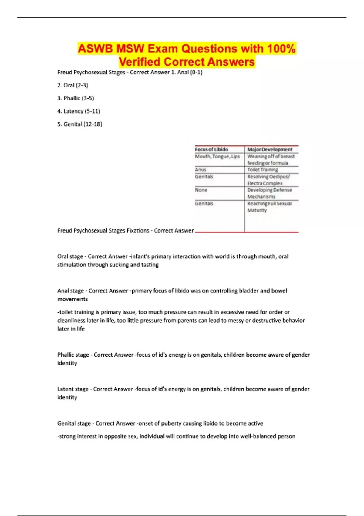 ASWB MSW Exam Questions with 100% Verified Correct Answers Freud Psychosexual Stages - Correct Answer 1. Anal (0-1) 2. Oral (2-3) 3. Phallic (3-5) 4. Latency (5-11) 5. Genital (12-18) Freud Psychosexual Stages Fixations - Correct Answer Oral stage - Correct Answer -infant's primary interaction with world is through mouth, oral stimulation through sucking and tasting Anal stage - Correct Answer -primary focus of libido was on controlling bladder and bowel movements -toilet training is primary issue, too much pressure can result in excessive need for order or cleanliness later in life, too little pressure from parents can lead to messy or destructive behavior later in life Phallic stage - Correct Answer -focus of id's energy is on genitals, children become aware of gender identity Latent stage - Correct Answer -focus of id's energy is on genitals, children become aware of gender identity Genital stage - Correct Answer -onset of puberty causing libido to become active -strong interest in opposite sex, individual will continue to develop into well-balanced person Piaget Stages of Development - Correct Answer Sensorimotor (0-2) Preoperational thought (2.5 - 6/7) Concrete operations (7-11) Formal Operations (11-18) Sensorimotor Stage - Correct Answer -learn primarily through sensory input and action -object permanence, causality, symbolic thought Preoperational Thought - Correct Answer -child is able to use words and images to refer to objects Concrete operations - Correct Answer - think logically but have difficulty with abstracts or hypotheticals Formal Operations - Correct Answer - can think abstractly, use deductive reasoning, and systematically plan Erikson's Psychosocial Stages - Correct Answer 1. Trust vs Mistrust 2. Autonomy vs Shame & Doubt 3. Initiative vs Guilt 4. Industry vs Inferiority 5. Identity vs Identity Diffusion 6. Intimacy vs Isolation 7. Generativity vs Self-Absorption 8. Integrity vs Despair