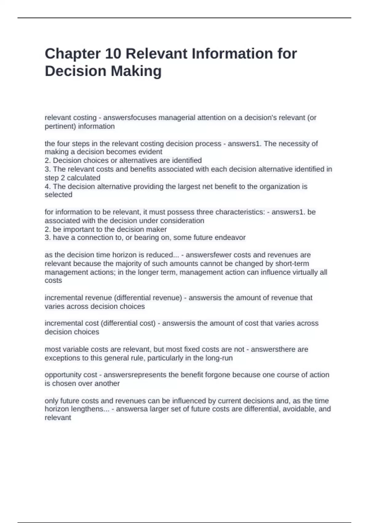 Chapter 10 Relevant Information for Decision Making questions and answers