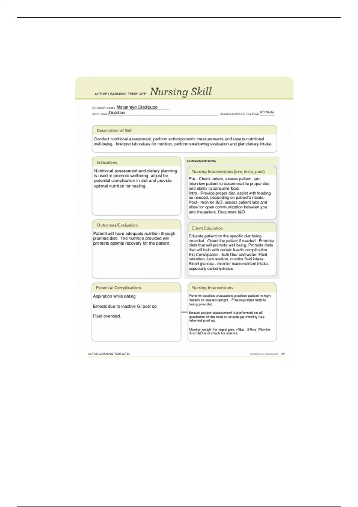 Nutritional assessment and dietary planning Nursing Interventions (pre, intra, post)