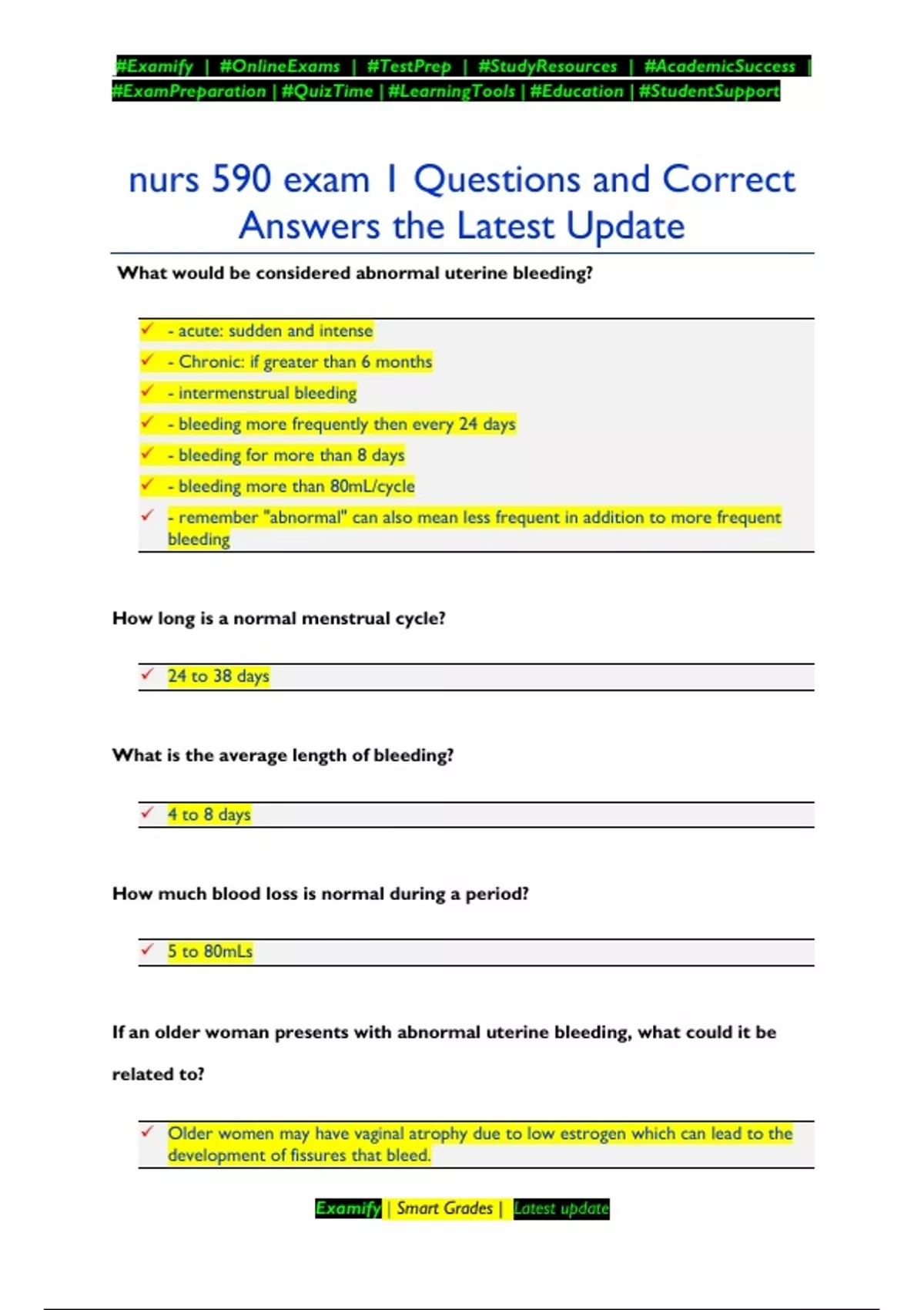 What would be considered abnormal uterine bleeding? - acute: sudden and intense - Chronic: if greater than 6 months - intermenstrual bleeding - bleeding more frequently then every 24 days - bleeding for more than 8 days - bleeding more than 80mL/cycle - remember "abnormal" can also mean less frequent in addition to more frequent bleeding How long is a normal menstrual cycle? 24 to 38 days What is the average length of bleeding? 4 to 8 days How much blood loss is normal during a period? 5 to 80mLs If an older woman presents with abnormal uterine bleeding, what could it be related to? Older women may have vaginal atrophy due to low estrogen which can lead to the development of fissures that bleed. #Examify | #OnlineExams | #TestPrep | #StudyResources | #AcademicSuccess | #ExamPreparation | #QuizTime | #LearningTools | #Education | #StudentSupport Examify | Smart Grades | Latest update What is the acronym for abnormal uterine bleeding? PALM-COEIN What does the acronym for PALM-COEIN stand for? P - polyp A - adenomyosis L - Leiomyoma M - malignancy C - coagulopathy O - ovulatory dysfunction E - endometrial I - iatrogenic N - not otherwise classified How common are uterine polyps? Up to 35% of women will have this at sometime in their life. As a woman ages, they are at greater risk for getting polyps. Presentation of uterine polyp: - intermenstrual bleeding - bleeding after sexual intercourse - Can sometimes see with speculum exam if it has prolapsed through the cervix What do you do if you are performing a speculum exam and see a polyp popping through the cerv