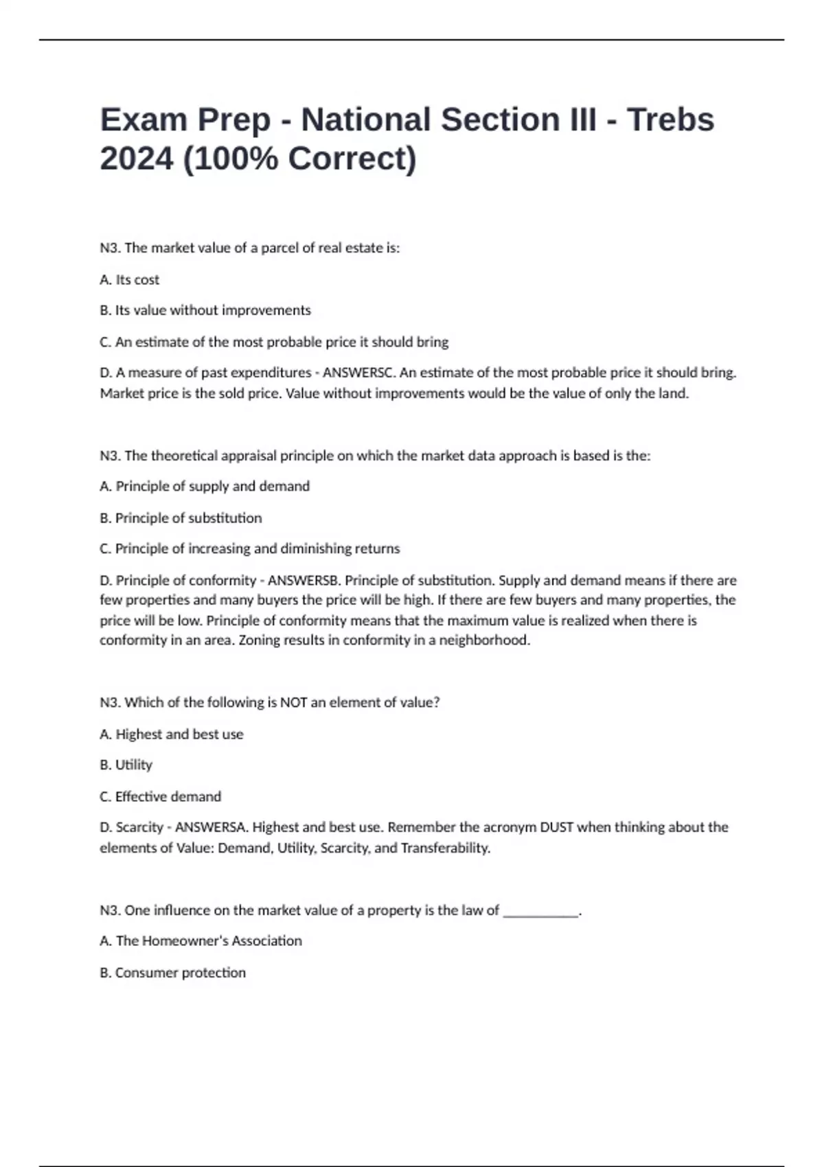 N3. The market value of a parcel of real estate is: A. Its cost B. Its value without improvements C. An estimate of the most probable price it should bring D. A measure of past expenditures - ANSWERSC. An estimate of the most probable price it should bring. Market price is the sold price. Value without improvements would be the value of only the land. N3. The theoretical appraisal principle on which the market data approach is based is the: A. Principle of supply and demand B. Principle of substitution C. Principle of increasing and diminishing returns D. Principle of conformity - ANSWERSB. Principle of substitution. Supply and demand means if there are few properties and many buyers the price will be high. If there are few buyers and many properties, the price will be low. Principle of conformity means that the maximum value is realized when there is conformity in an area. Zoning results in conformity in a neighborhood. N3. Which of the following is NOT an element of value? A. Highest and best use B. Utility C. Effective demand D. Scarcity - ANSWERSA. Highest and best use. Remember the acronym DUST when thinking about the elements of Value: Demand, Utility, Scarcity, and Transferability. N3. One influence on the market value of a property is the law of __________. A. The Homeowner's Association B. Consumer protection C. Rentability D. Supply and demand - ANSWERSD. Supply and demand. If the supply of houses increases, prices fall. If the supply of houses is scarce for the market demand, prices will rise (sometimes dramatically).