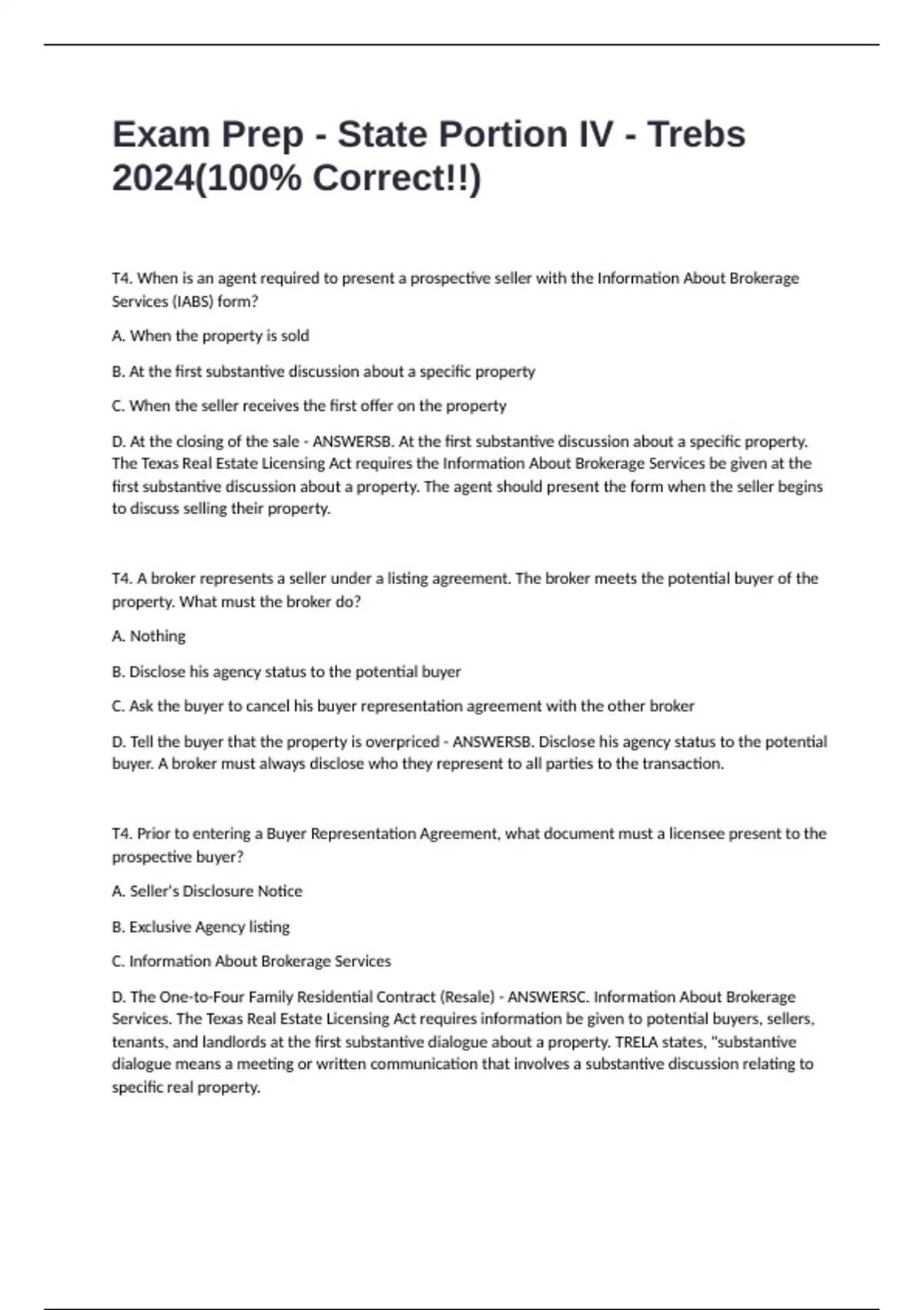 T4. When is an agent required to present a prospective seller with the Information About Brokerage Services (IABS) form? A. When the property is sold B. At the first substantive discussion about a specific property C. When the seller receives the first offer on the property D. At the closing of the sale - ANSWERSB. At the first substantive discussion about a specific property. The Texas Real Estate Licensing Act requires the Information About Brokerage Services be given at the first substantive discussion about a property. The agent should present the form when the seller begins to discuss selling their property. T4. A broker represents a seller under a listing agreement. The broker meets the potential buyer of the property. What must the broker do? A. Nothing B. Disclose his agency status to the potential buyer C. Ask the buyer to cancel his buyer representation agreement with the other broker D. Tell the buyer that the property is overpriced - ANSWERSB. Disclose his agency status to the potential buyer. A broker must always disclose who they represent to all parties to the transaction. T4. Prior to entering a Buyer Representation Agreement, what document must a licensee present to the prospective buyer? A. Seller's Disclosure Notice B. Exclusive Agency listing C. Information About Brokerage Services D. The One-to-Four Family Residential Contract (Resale) - ANSWERSC. Information About Brokerage Services. The Texas Real Estate Licensing Act requires information be given to potential buyers, sellers, tenants, and landlords at the first substantive dialogue about a property. TRELA states, "substantive dialogue means a meeting or written communication that involves a substantive discussion relating to specific real property. T4. Information About Brokerage Services should always be given and explained: A. This form is never used. B. After the contract has been signed C. After the closing of the transaction D. At the beginning of the listing presentation - ANSWERSD. At the beginning of the listing presentation. The Information for Brokerage Services states that the form will be presented at the first substantive discussion with the prospect. The listing presentation is considered substantive conversation.