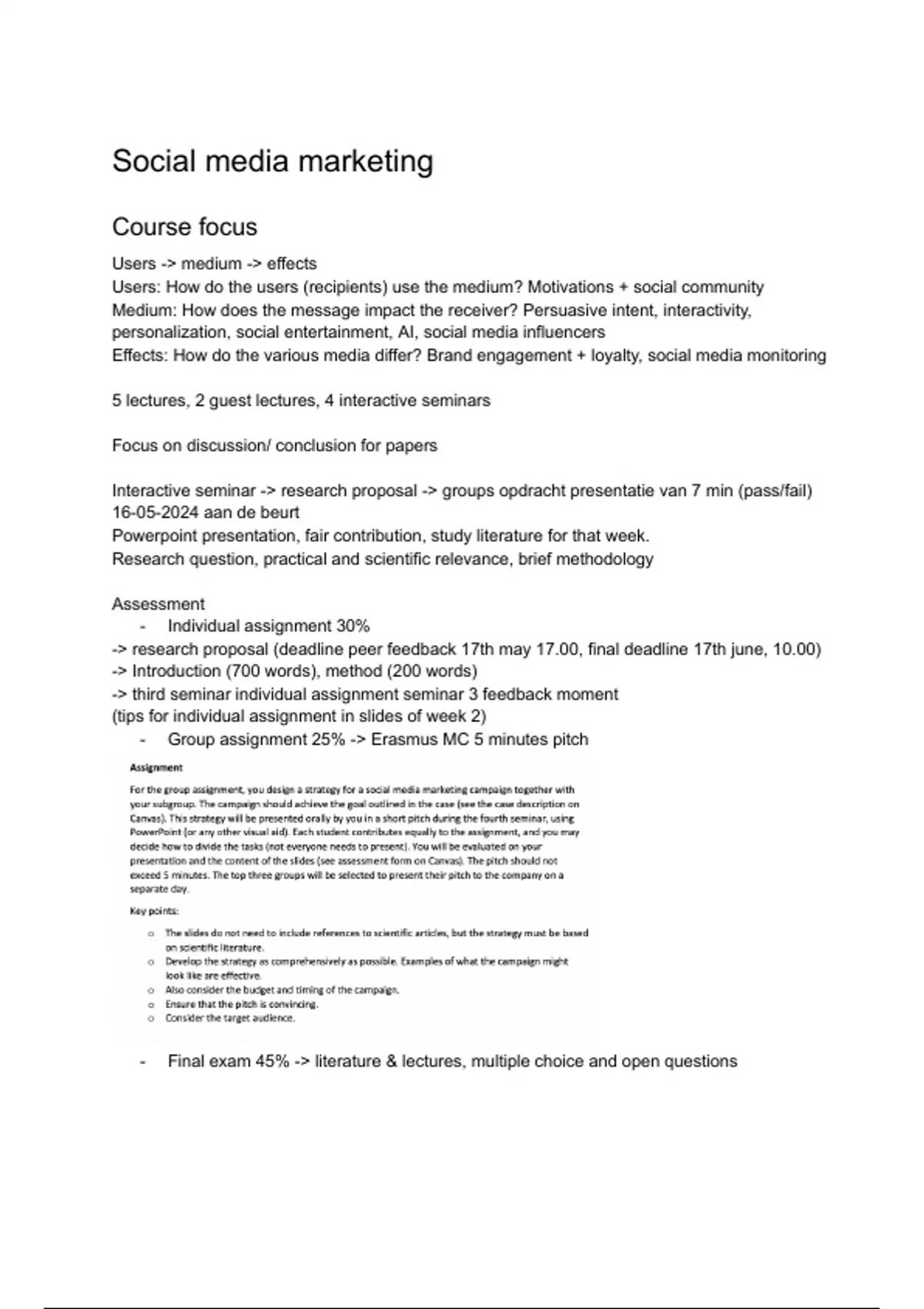 - Group assignment 25% -> Erasmus MC 5 minutes pitch