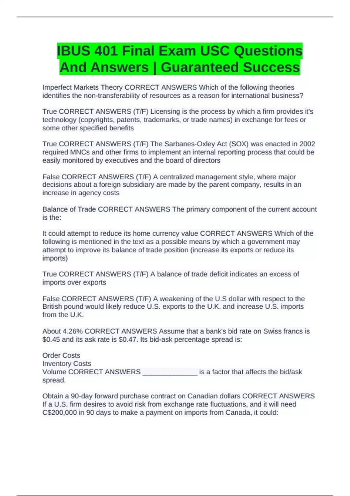 Exchanging dollars for foreign currency CORRECT ANSWERS Which of the following is