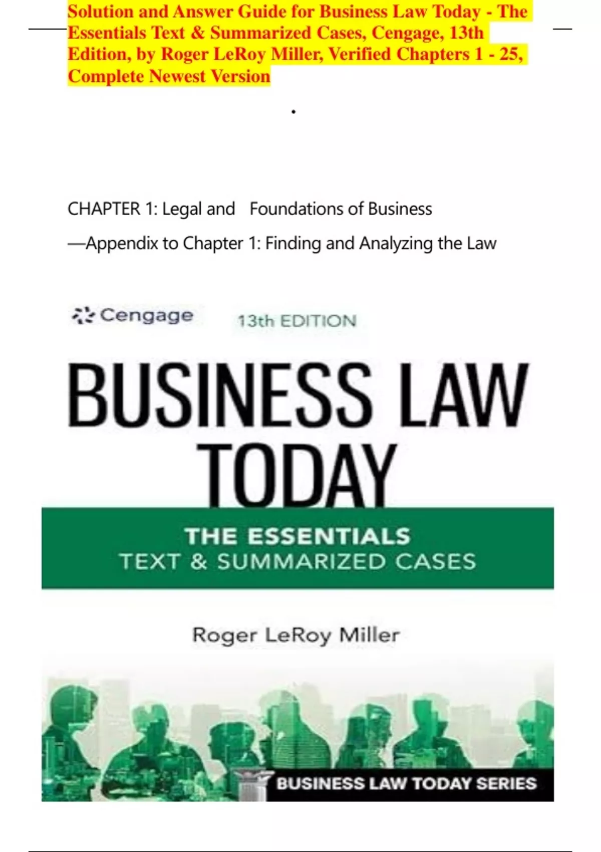 Solution and Answer Guide for Business Law Today - The Essentials Text & Summarized Cases, Cengage, 13th Edition, by Roger LeRoy Miller, Verified Chapters 1 - 25, Complete Newest Version Solution and Answer Guide for Business Law Today - The Essentials Text & Summarized Cases, Cengage, 13th Edition, by Roger LeRoy Miller, Verified Chapters 1 - 25, Complete Newest Version