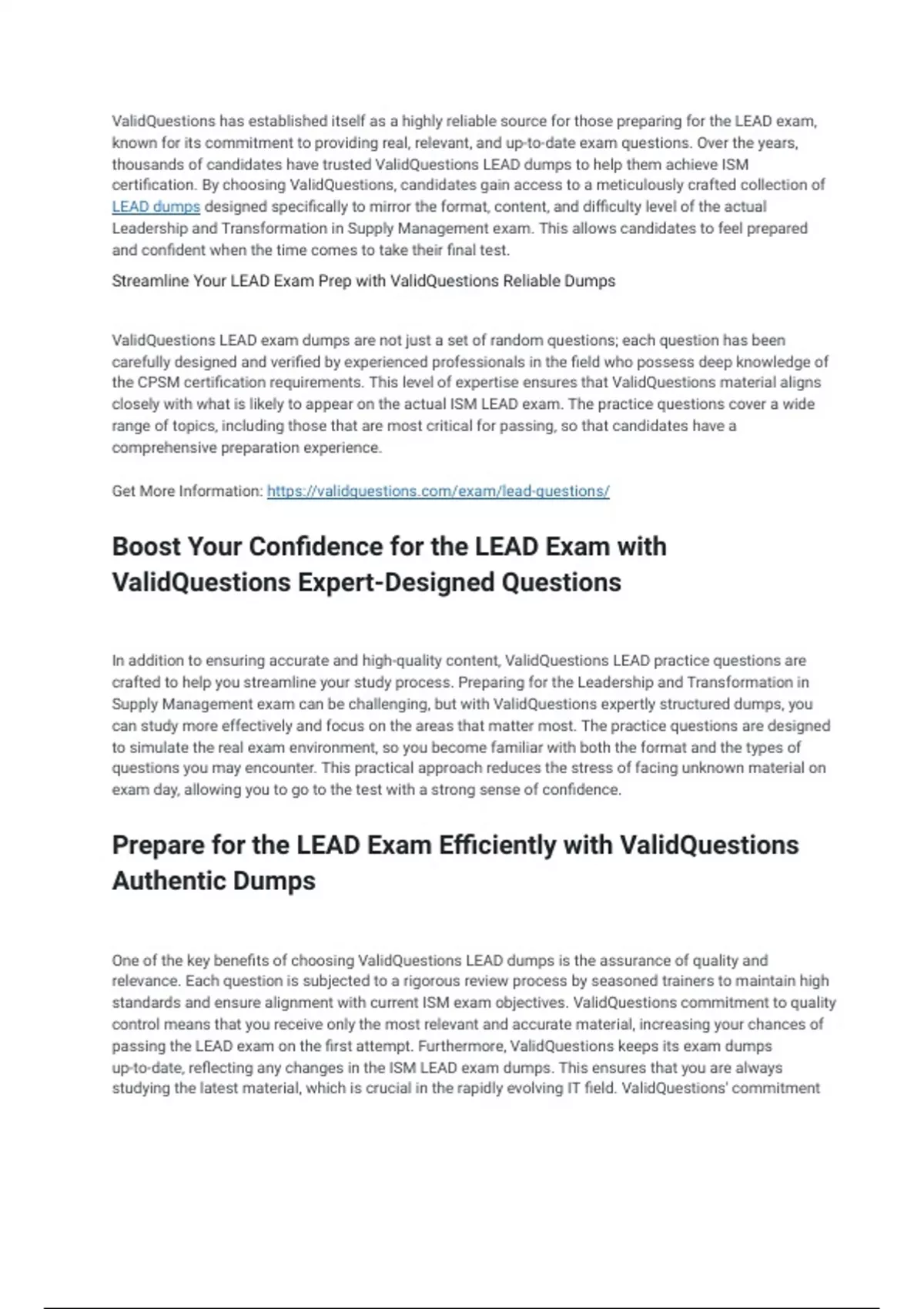 ValidQuestions has established itself as a highly reliable source for those preparing for the LEAD exam,