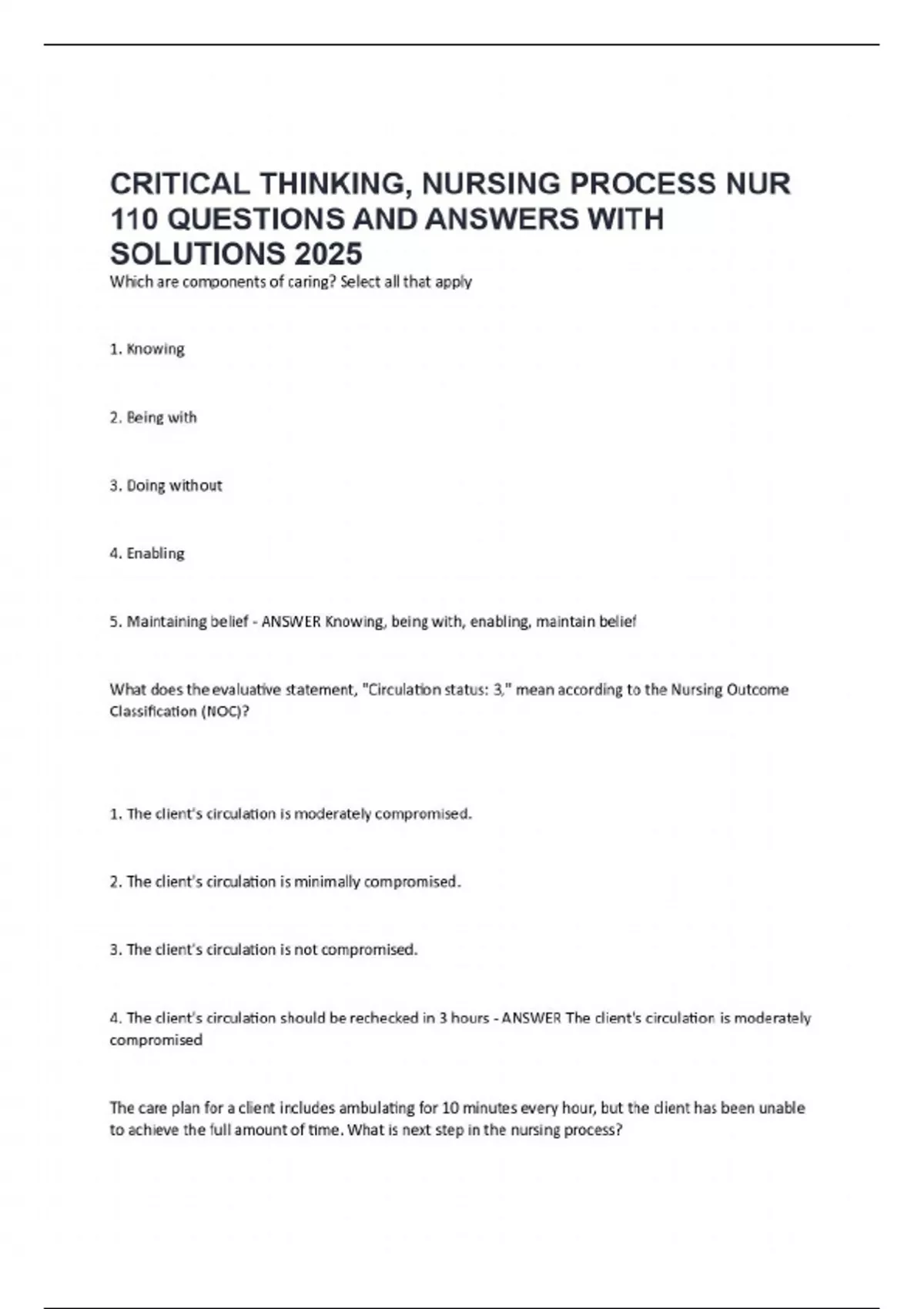 CRITICAL THINKING, NURSING PROCESS NUR 110 QUESTIONS AND ANSWERS WITH SOLUTIONS 2025