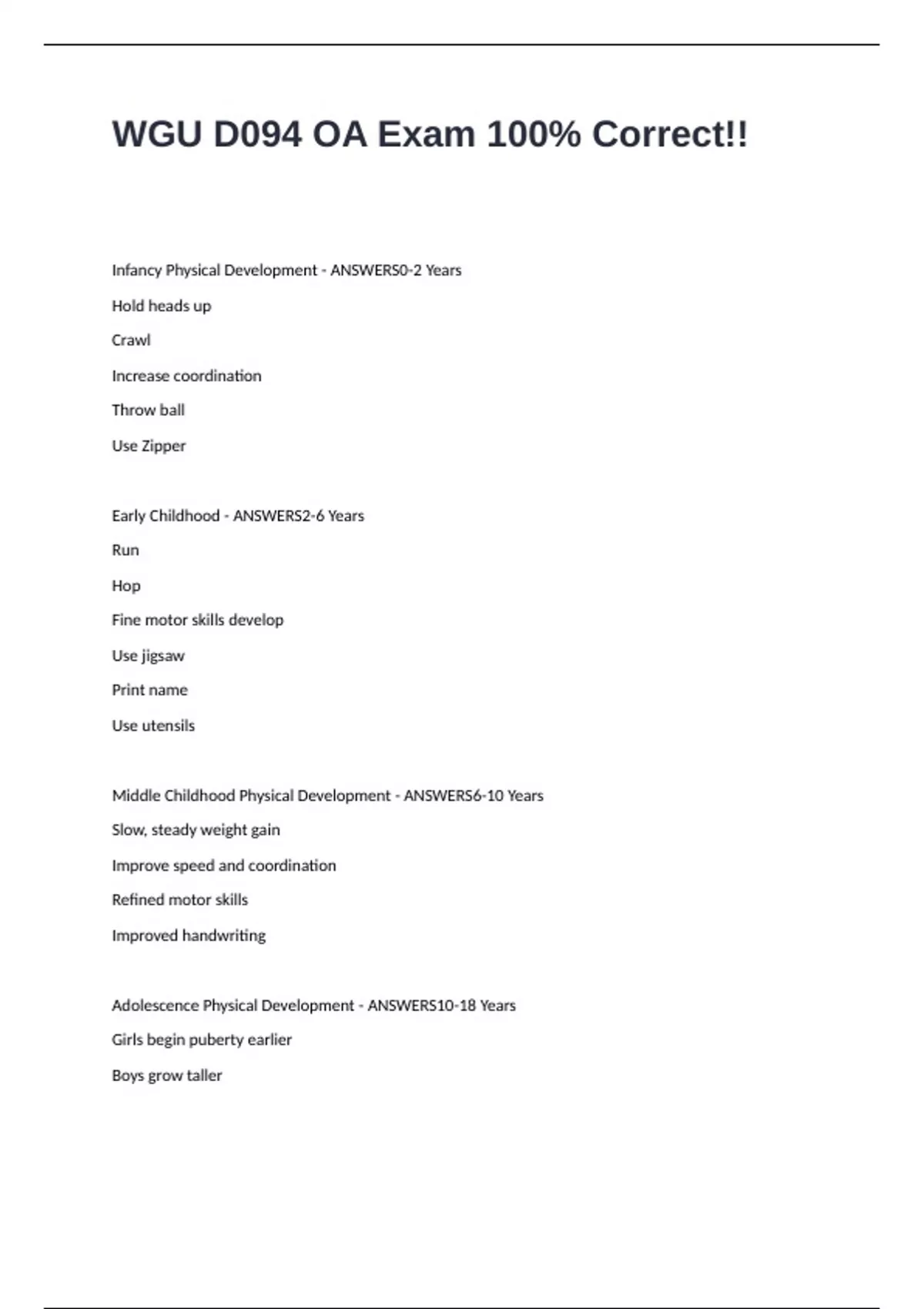 Infancy Physical Development - ANSWERS0-2 Years Hold heads up Crawl Increase coordination Throw ball Use Zipper Early Childhood - ANSWERS2-6 Years Run Hop Fine motor skills develop Use jigsaw Print name Use utensils Middle Childhood Physical Development - ANSWERS6-10 Years Slow, steady weight gain Improve speed and coordination Refined motor skills Improved handwriting Adolescence Physical Development - ANSWERS10-18 Years Girls begin puberty earlier Boys grow taller Reach sexual maturity Girls' physical growth slows