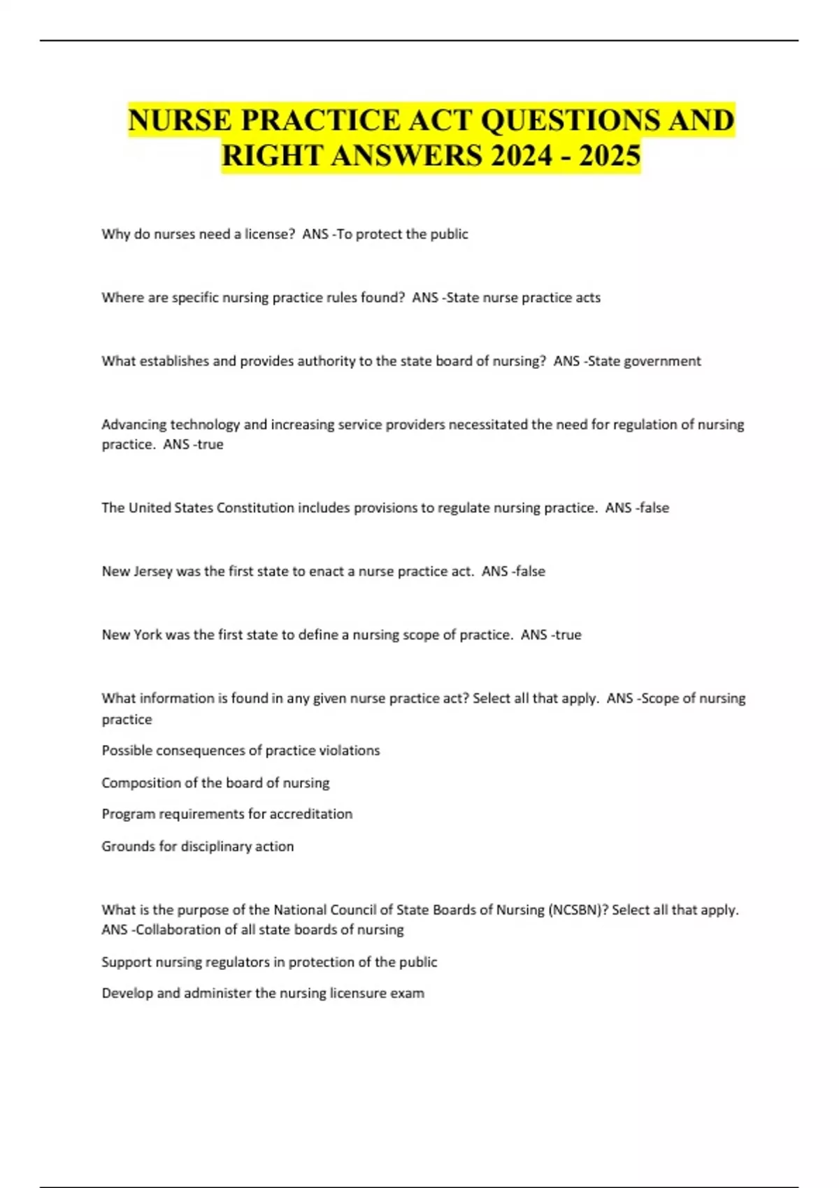 NURSE PRACTICE ACT QUESTIONS AND RIGHT ANSWERS