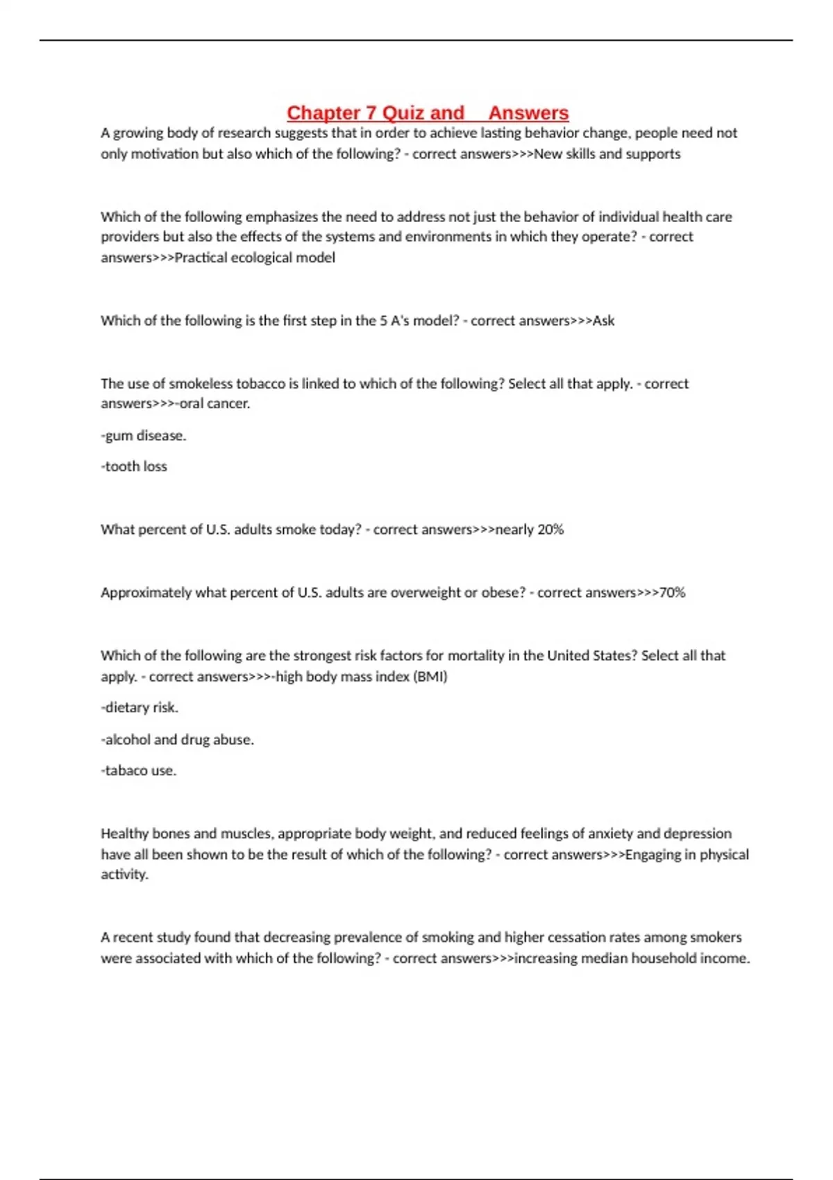 Chapter 7 Quiz and Answers A growing body of research suggests that in order to achieve lasting behavior change, people need not only motivation but also which of the following? - correct answers>>>New skills and supports Which of the following emphasizes the need to address not just the behavior of individual health care providers but also the effects of the systems and environments in which they operate? - correct answers>>>Practical ecological model Which of the following is the first step in the 5 A's model? - correct answers>>>Ask The use of smokeless tobacco is linked to which of the following? Select all that apply. - correct answers>>>-oral cancer. -gum disease. -tooth loss What percent of U.S. adults smoke today? - correct answers>>>nearly 20% Approximately what percent of U.S. adults are overweight or obese? - correct answers>>>70% Which of the following are the strongest risk factors for mortality in the United States? Select all that apply. - correct answers>>>-high body mass index (BMI) -dietary risk. -alcohol and drug abuse. -tabaco use. Healthy bones and muscles, appropriate body weight, and reduced feelings of anxiety and depression have all been shown to be the result of which of the following? - correct answers>>>Engaging in physical activity. A recent study found that decreasing prevalence of smoking and higher cessation rates among smokers were associated with which of the following? - correct answers>>>increasing median household income.