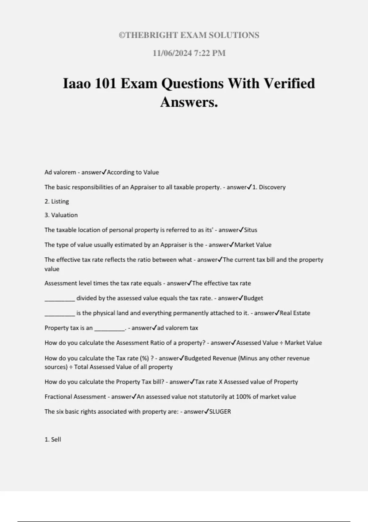 Iaao 101 Exam Questions With Verified Answers. Ad valorem - answerAccording to Value The basic responsibilities of an Appraiser to all taxable property. - answer1. Discovery 2. Listing 3. Valuation The taxable location of personal property is referred to as its' - answerSitus The type of value usually estimated by an Appraiser is the - answerMarket Value The effective tax rate reflects the ratio between what - answerThe current tax bill and the property value Assessment level times the tax rate equals - answerThe effective tax rate _________ divided by the assessed value equals the tax rate. - answerBudget _________ is the physical land and everything permanently attached to it. - answerReal Estate Property tax is an _________. - answerad valorem tax How do you calculate the Assessment Ratio of a property? - answerAssessed Value ÷ Market Value How do you calculate the Tax rate (%) ? - answerBudgeted Revenue (Minus any other revenue sources) ÷ Total Assessed Value of all property How do you calculate the Property Tax bill? - answerTax rate X Assessed value of Property Fractional Assessment - answerAn assessed value not statutorily at 100% of market value The six basic rights associated with property are: - answerSLUGER 1. Sell