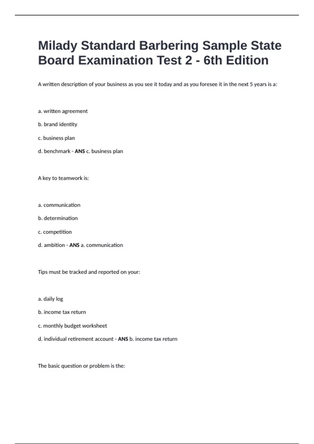 Milady Standard Barbering Sample State Board Examination Test 2 - 6th Edition Milady Standard Barbering Sample State Board Examination Test 2 - 6th Edition Milady Standard Barbering Sample State Board Examination Test 2 - 6th Edition