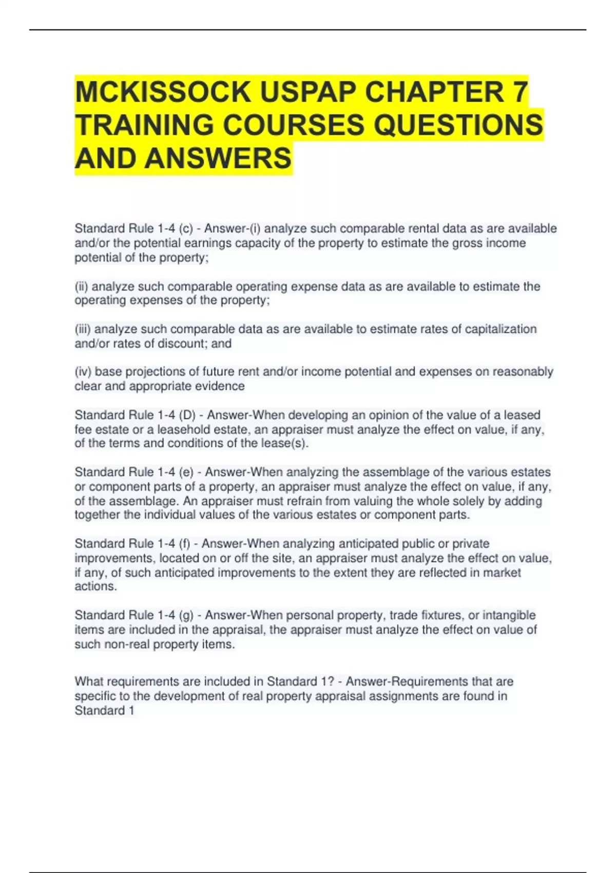 MCKISSOCK USPAP CHAPTER 7 TRAINING COURSES QUESTIONS AND ANSWERS Standard Rule 1-4 (c) - Answer-(i) analyze such comparable rental data as are available and/or the potential earnings capacity of the property to estimate the gross income potential of the property; (ii) analyze such comparable operating expense data as are available to estimate the operating expenses of the property; (iii) analyze such comparable data as are available to estimate rates of capitalization and/or rates of discount; and (iv) base projections of future rent and/or income potential and expenses on reasonably clear and appropriate evidence Standard Rule 1-4 (D) - Answer-When developing an opinion of the value of a leased fee estate or a leasehold estate, an appraiser must analyze the effect on value, if any, of the terms and conditions of the lease(s). Standard Rule 1-4 (e) - Answer-When analyzing the assemblage of the various estates or component parts of a property, an appraiser must analyze the effect on value, if any, of the assemblage. An appraiser must refrain from valuing the whole solely by adding together the individual values of the various estates or component parts. Standard Rule 1-4 (f) - Answer-When analyzing anticipated public or private improvements, located on or off the site, an appraiser must analyze the effect on value, if any, of such anticipated improvements to the extent they are reflected in market actions. Standard Rule 1-4 (g) - Answer-When personal property, trade fixtures, or intangible items are included in the appraisal, the appraiser must analyze the effect on value of such non-real property items. What requirements are included in Standard 1? - Answer-Requirements that are specific to the development of real property appraisal assignments are found in Standard 1