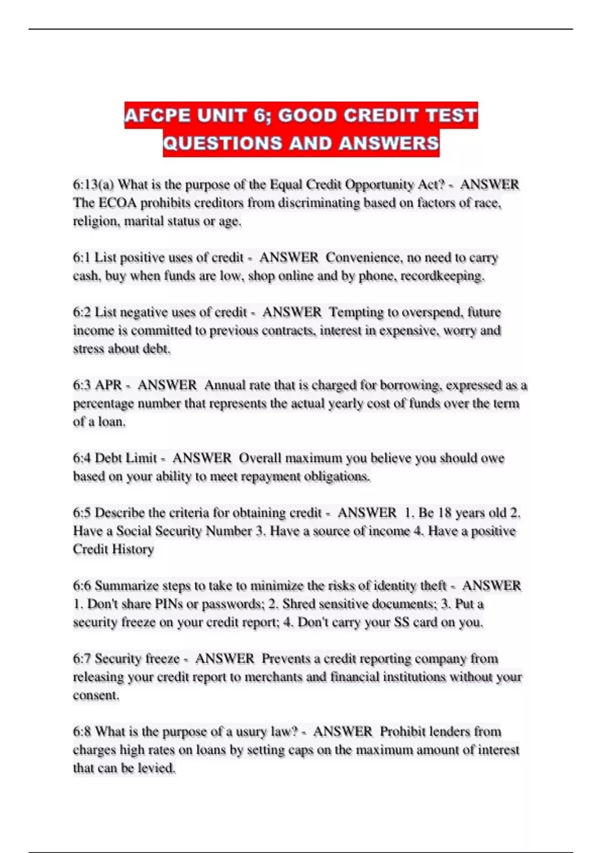 AFCPE UNIT 6; GOOD CREDIT TEST QUESTIONS AND ANSWERS...