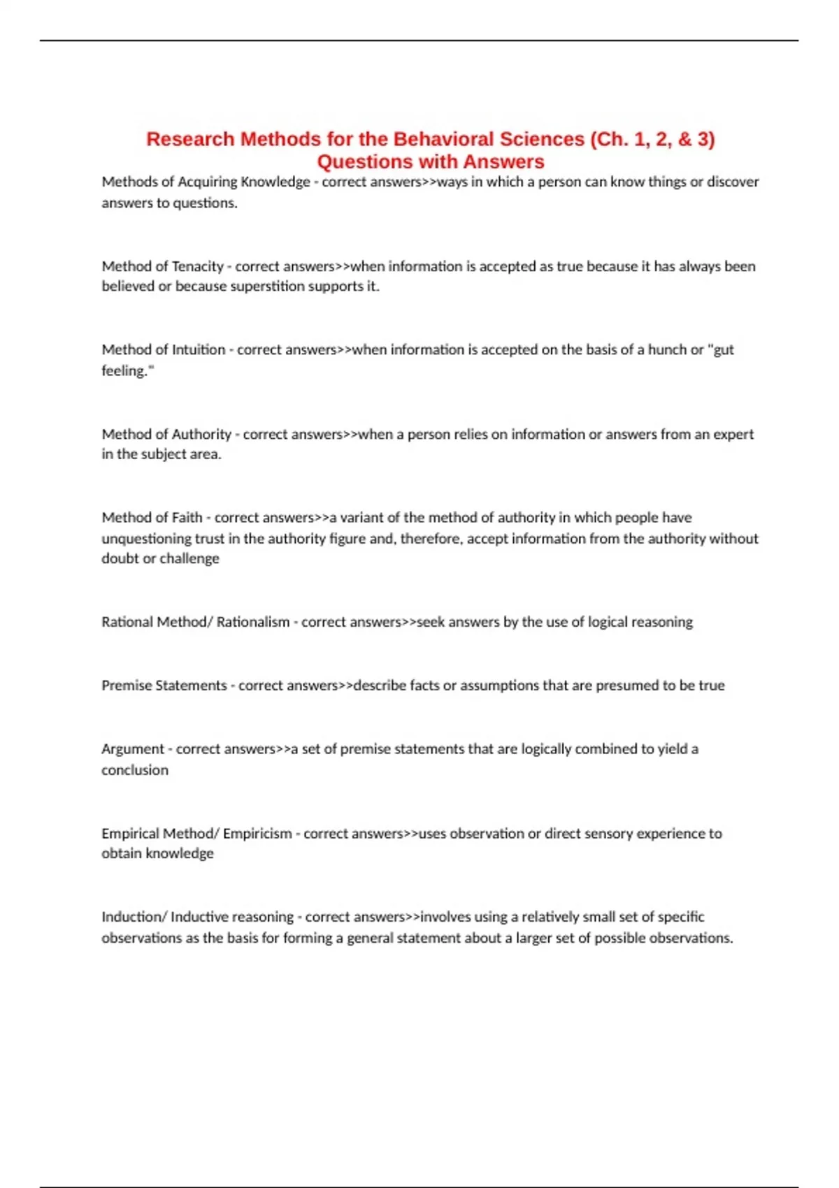 Research Methods for the Behavioral Sciences (Ch. 1, 2, & 3) Questions with Answers Methods of Acquiring Knowledge - correct answers>>ways in which a person can know things or discover answers to questions. Method of Tenacity - correct answers>>when information is accepted as true because it has always been believed or because superstition supports it. Method of Intuition - correct answers>>when information is accepted on the basis of a hunch or "gut feeling." Method of Authority - correct answers>>when a person relies on information or answers from an expert in the subject area. Method of Faith - correct answers>>a variant of the method of authority in which people have unquestioning trust in the authority figure and, therefore, accept information from the authority without doubt or challenge Rational Method/ Rationalism - correct answers>>seek answers by the use of logical reasoning Premise Statements - correct answers>>describe facts or assumptions that are presumed to be true Argument - correct answers>>a set of premise statements that are logically combined to yield a conclusion Empirical Method/ Empiricism - correct answers>>uses observation or direct sensory experience to obtain knowledge Induction/ Inductive reasoning - correct answers>>involves using a relatively small set of specific observations as the basis for forming a general statement about a larger set of possible observations. Variables - correct answers>>characteristics or conditions that change or have different values for different individuals. For example, the weather the economy, and your state of health can change from day to day. Also, two people can be different in terms of personality, intelligence, age, gender, self-esteem, height, weight, and so on.