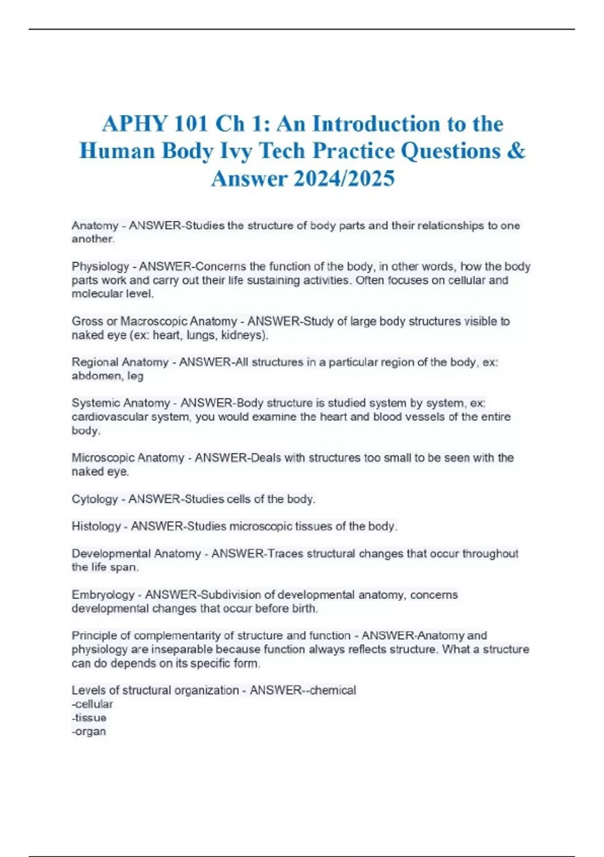 APHY 101 Ch 1: An Introduction to the Human Body Ivy Tech Practice Questions & Answer 2024/2025