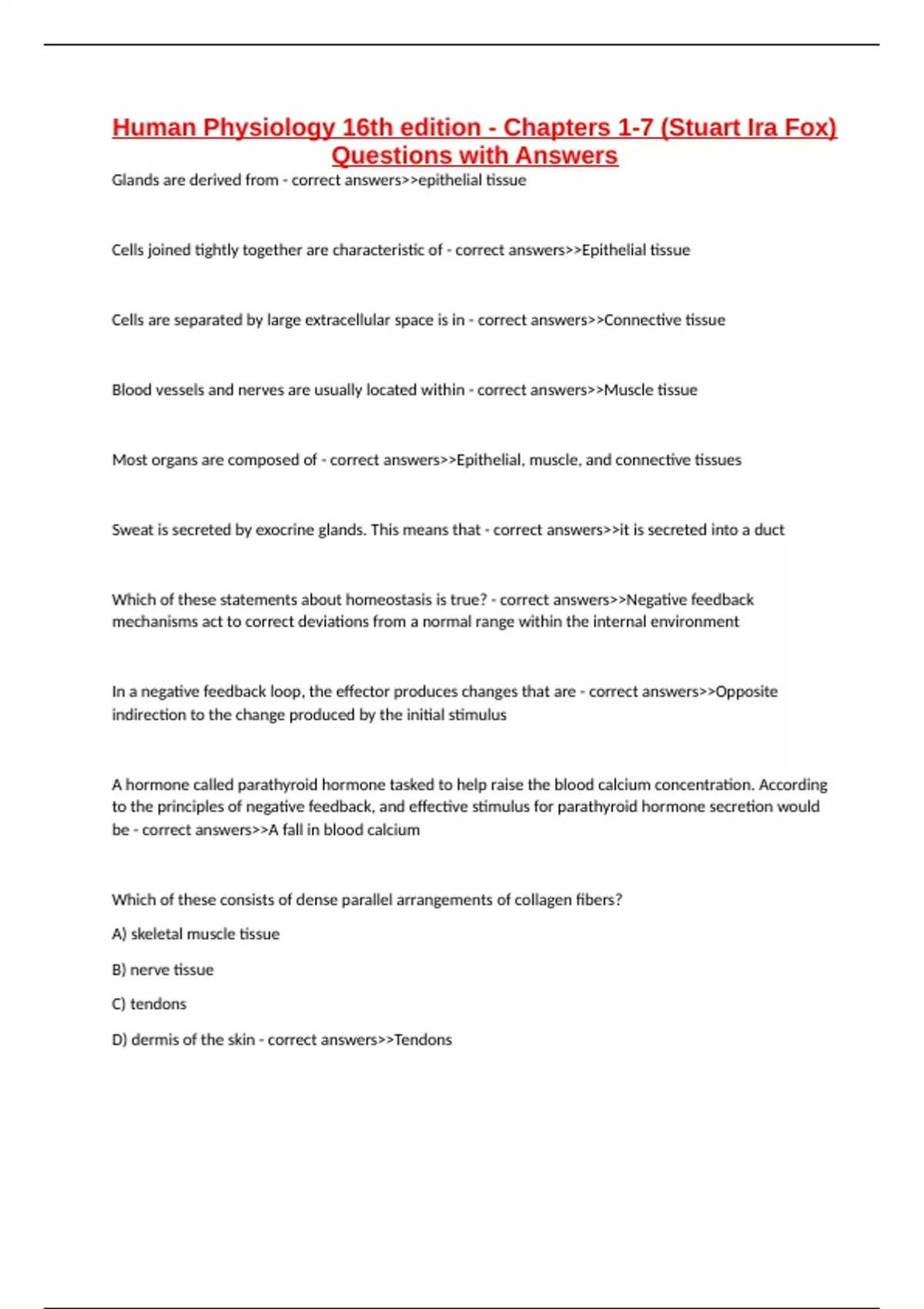 Human Physiology 16th edition - Chapters 1-7 (Stuart Ira Fox) Questions with Answers Glands are derived from - correct answers>>epithelial tissue Cells joined tightly together are characteristic of - correct answers>>Epithelial tissue Cells are separated by large extracellular space is in - correct answers>>Connective tissue Blood vessels and nerves are usually located within - correct answers>>Muscle tissue Most organs are composed of - correct answers>>Epithelial, muscle, and connective tissues Sweat is secreted by exocrine glands. This means that - correct answers>>it is secreted into a duct Which of these statements about homeostasis is true? - correct answers>>Negative feedback mechanisms act to correct deviations from a normal range within the internal environment In a negative feedback loop, the effector produces changes that are - correct answers>>Opposite indirection to the change produced by the initial stimulus A hormone called parathyroid hormone tasked to help raise the blood calcium concentration. According to the principles of negative feedback, and effective stimulus for parathyroid hormone secretion would be - correct answers>>A fall in blood calcium Which of these consists of dense parallel arrangements of collagen fibers? A) skeletal muscle tissue B) nerve tissue C) tendons D) dermis of the skin - correct answers>>Tendons The act of breathing raises the blood oxygen level, lowers the blood carbon dioxide concentration, and raises blood pH. According to the principles of negative feedback, sensors that regulate breathing should respond to - correct answers>>A rise in blood carbon dioxide concentration Adult stem cells, such as those in the bone marrow, brain, or hair follicles can best be described as ____________, whereas embryonic stem cells are described as ____________. - correct answers>>multipotent; pluripotent