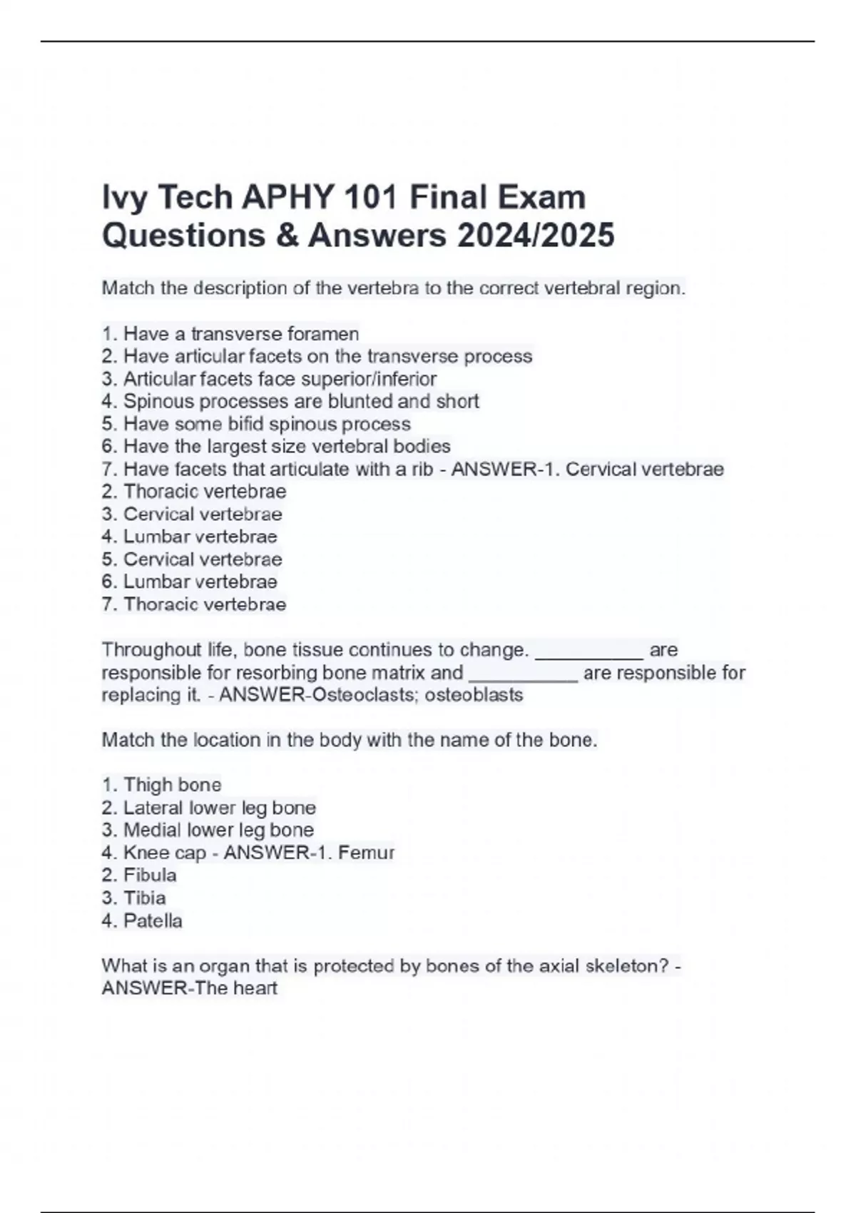 Ivy Tech APHY 101 Final Exam Questions & Answers 2024/2025 Match the description of the vertebra to the correct vertebral region. 1. Have a transverse foramen 2. Have articular facets on the transverse process 3. Articular facets face superior/inferior 4. Spinous processes are blunted and short 5. Have some bifid spinous process 6. Have the largest size vertebral bodies 7. Have facets that articulate with a rib - ANSWER-1. Cervical vertebrae 2. Thoracic vertebrae 3. Cervical vertebrae 4. Lumbar vertebrae 5. Cervical vertebrae 6. Lumbar vertebrae 7. Thoracic vertebrae Throughout life, bone tissue continues to change. __________ are responsible for resorbing bone matrix and __________ are responsible for replacing it. - ANSWER-Osteoclasts; osteoblasts Match the location in the body with the name of the bone. 1. Thigh bone 2. Lateral lower leg bone 3. Medial lower leg bone 4. Knee cap - ANSWER-1. Femur 2. Fibula 3. Tibia 4. Patella What is an organ that is protected by bones of the axial skeleton? - ANSWER-The heart Bone tissue is largely composed of what two items? - ANSWER-Collagen and inorganic salts What is the role of vitamin D in bone development? - ANSWER-Vitamin D increases calcium absorption from the small intestine which is used to build bone matrix. What is the definition of hematopoiesis? - ANSWER-The process of blood cell formation What happens when the epiphyseal plate is ossified? - ANSWER-Lengthening of the bone is no longer possible. Match the location in the body with the name of the bone. 1. Upper arm bone 2. Collar bone 3. Shoulder blade 4. Lateral bone of the forearm 5. Medial bone of the forearm - ANSWER-1. Humerus 2. Clavicle 3. Scapula 4. Radius 5. Ulna From what do intramembranous bones form? - ANSWER-From sheetlike layers of unspecialized connective tissue The osteocytes in compact bone are arranged within cylinder-shaped units called __________. - ANSWER-osteons Which of the following is found inferior to the maxilla and has a posterior articulation with the temporal bone? - ANSWER-Mandibular bone Based on their shape, the bones of the Cranium can be classified as what type of bone? - ANSWER-Flat bones What is the end of a long bone called? - ANSWER-Epiphysis What is a function of bone that is due to its relationship with skeletal muscle? - ANSWER-Movement of limbs What type of synovial joint involves two flat (or nearly flat) bone surfaces? - ANSWER-Plane joint Match the descriptions to the structures associated with synovial joints. 1. Fibrocartilage discs within joint 2. Fluid-filled sacs 3. Lining of joint cavity; secretes fluid 4. Protective layer that covers bone ends - ANSWER-1. Menisci 2. Bursae 3. Synovial membrane 4. Articular cartilage Match the description to the correct joint disorder. 1. Inflammation of fluid-filled sacs associated with a joint 2. Torn or overstretched ligaments 3. Intermittent disorder caused by bacterial infection 4. Inflammation of a joint due to autoimmune condition 5. Degenerative disorder of joints - ANSWER-1. Bursitis 2. Sprain 3. Lyme arthritis 4. Rheumatoid arthritis 5. Osteoarthritis Movement of a body part backward along the transverse plane is called __________ . - ANSWER-retraction What is the movement of a body part away from the midline in the frontal plane called? - ANSWER-Abduction Match each of the joint movements with the correct example. 1. Bending the knee Continues...