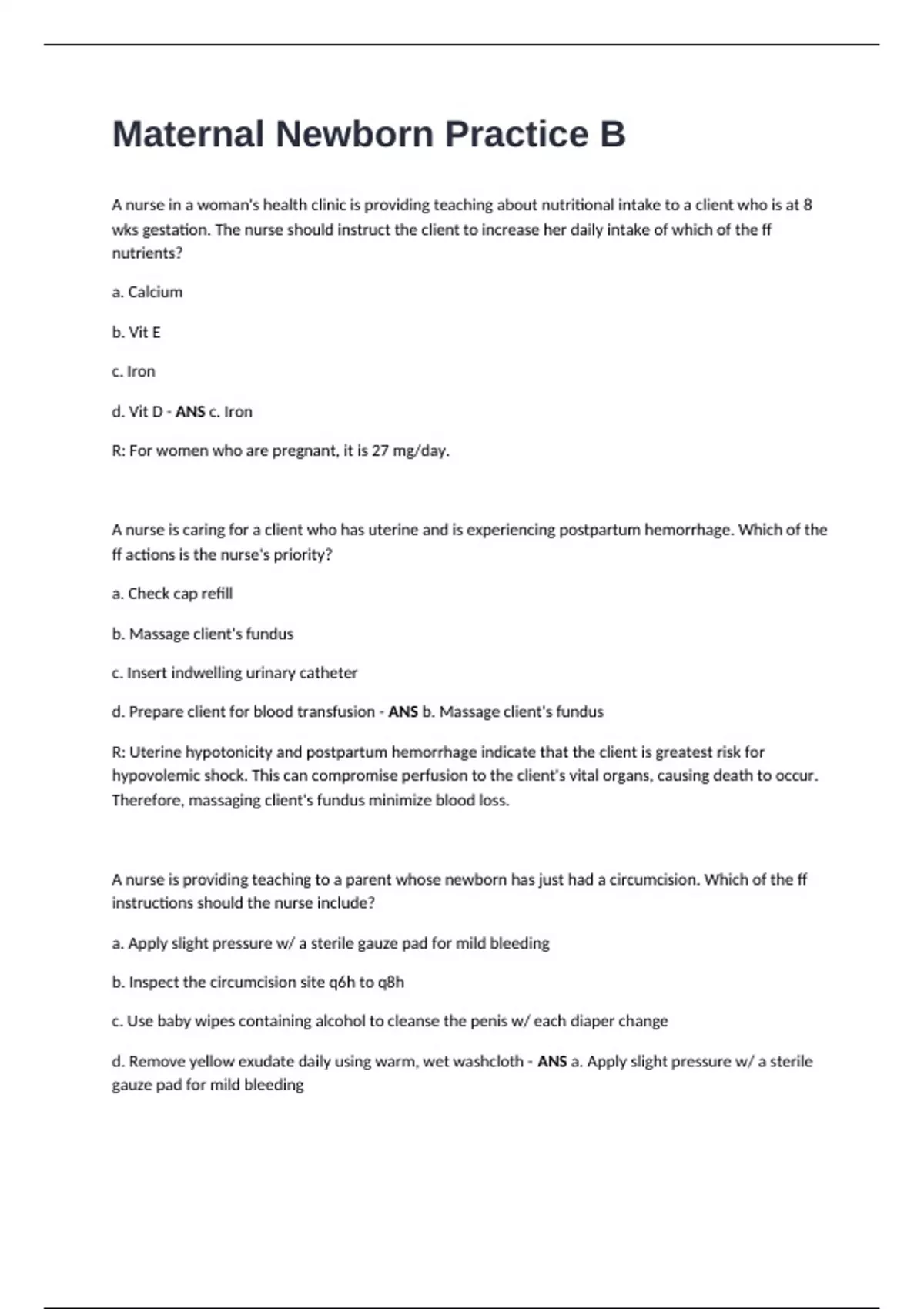 d. Prepare client for blood transfusion - ANS b. Massage client's fundus
