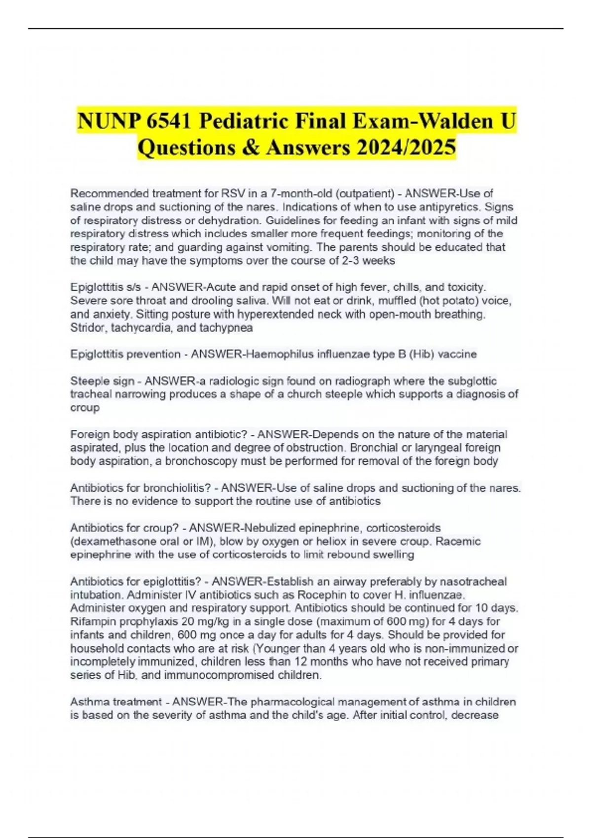 NUNP 6541 Pediatric Final Exam-Walden U Questions & Answers 2024/2025 Recommended treatment for RSV in a 7-month-old (outpatient) - ANSWER-Use of saline drops and suctioning of the nares. Indications of when to use antipyretics. Signs of respiratory distress or dehydration. Guidelines for feeding an infant with signs of mild respiratory distress which includes smaller more frequent feedings; monitoring of the respiratory rate; and guarding against vomiting. The parents should be educated that the child may have the symptoms over the course of 2-3 weeks Epiglottitis s/s - ANSWER-Acute and rapid onset of high fever, chills, and toxicity. Severe sore throat and drooling saliva. Will not eat or drink, muffled (hot potato) voice, and anxiety. Sitting posture with hyperextended neck with open-mouth breathing. Stridor, tachycardia, and tachypnea Epiglottitis prevention - ANSWER-Haemophilus influenzae type B (Hib) vaccine Steeple sign - ANSWER-a radiologic sign found on radiograph where the subglottic tracheal narrowing produces a shape of a church steeple which supports a diagnosis of croup Foreign body aspiration antibiotic? - ANSWER-Depends on the nature of the material aspirated, plus the location and degree of obstruction. Bronchial or laryngeal foreign body aspiration, a bronchoscopy must be performed for removal of the foreign body Antibiotics for bronchiolitis? - ANSWER-Use of saline drops and suctioning of the nares. There is no evidence to support the routine use of antibiotics Antibiotics for croup? - ANSWER-Nebulized epinephrine, corticosteroids (dexamethasone oral or IM), blow by oxygen or heliox in severe croup. Racemic epinephrine with the use of corticosteroids to limit rebound swelling Antibiotics for epiglottitis? - ANSWER-Establish an airway preferably by nasotracheal intubation. Administer IV antibiotics such as Rocephin to cover H. influenzae. Administer oxygen and respiratory support. Antibiotics should be continued for 10 days. Rifampin prophylaxis 20 mg/kg in a single dose (maximum of 600 mg) for 4 days for infants and children, 600 mg once a day for adults for 4 days. Should be provided for household contacts who are at risk (Younger than 4 years old who is non-immunized or incompletely immunized, children less than 12 months who have not received primary series of Hib, and immunocompromised children. Asthma treatment - ANSWER-The pharmacological management of asthma in children is based on the severity of asthma and the child's age. After initial control, decrease treatment to the least amount of medication needed to maintain control. Systemic corticosteroids may be needed at any time and stepped up if there is a major flare-up of symptoms. Step 1 Asthma management for children 0-4 years old - ANSWER-Step 1: SABA (Short acting beta2-agonist) PRN: With viral respiratory symptoms short acting beta 2-agonist should be used every 4-6 hours up to 24 hours (longer with a physician consult). Consider short course of oral systemic corticosteroids if severe exacerbation. Frequent use of SABA may indicate the need to step up treatment Step 2 Asthma management for children 0-4 years old - ANSWER-Step 2: Consider consultation with asthma specialist. Low dose of inhaled corticosteroids. Step 3 asthma mgmt for children 0-4 yrs - ANSWER-Step 3: Medium-dose of inhaled corticosteroids Steps 4-6 asthma mgmt for children 0-4 yrs - ANSWER-Step 4: Medium-dose ICS and Long acting beta2-agonist or montelukast. Step 5: High dose ICS and Long-acting beta 2-agonist or montelukast. Step 6: High dose of ICS and LABA or montelukast and oral corticosteroids Steps 1-3 asthma mgmt for children 5-11 yrs - ANSWER-Step 1: SABA (Short acting beta 2-agonist) PRN: Increasing the use of short-acting beta 2-agonist or use greater than 2 days a week for symptom relief generally indicates inadequate control and the need to step up treatment. Step 2: Consider consultation with asthma specialist. Low dose of inhaled corticosteroids. Step 3: Low dose of inhaled corticosteroid and LABA. Or medium dose of inhaled corticosteroids. Steps 4-6 asthma mgmt. for children 5-11 yrs - ANSWER-Step 4: Medium-dose ICS and LABA or medium dose of inhaled corticosteroid and leukotriene receptor antagonist or theophylline. . Step 5: High dose ICS and LABA or high dose of inhaled corticosteroid and leukotriene receptor antagonist or theophylline. . Step 6: High dose of ICS and LABA and oral corticosteroids or high dose of inhaled corticosteroids and leukotriene receptor antagonist or theophylline and oral corticosteroids. ** Theophylline levels must be monitored. Differentials for patient with sore throat - ANSWER-Strep pharyngitis Peritonsillar abscess Viral pharyngitis Infectious mononucleosis Epiglottitis small-for-gestational-age infants: which type of chromosomal analysis should be included? - ANSWER-Trisomy 18 Holt-Olram Trisomy 13 Turner Syndrome Trisomy 21 Continues...
