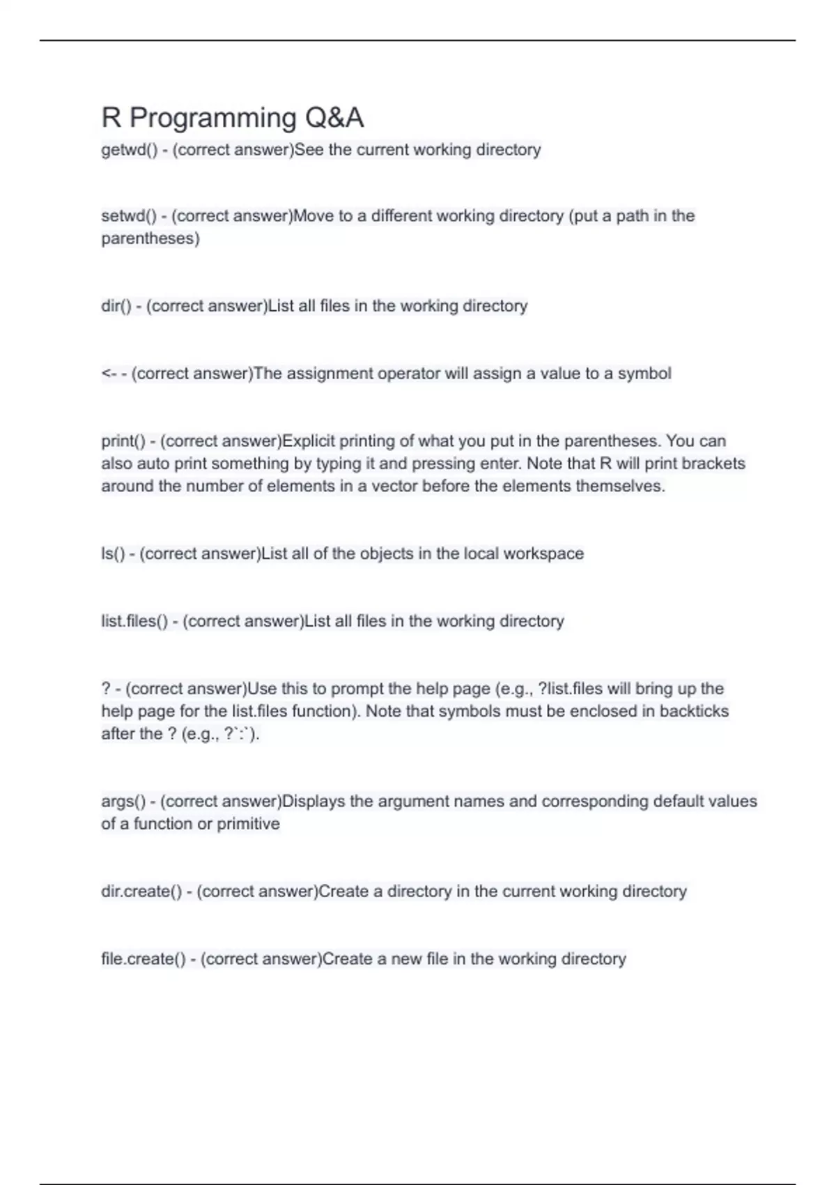 list.files() - (correct answer)List all files in the working directory