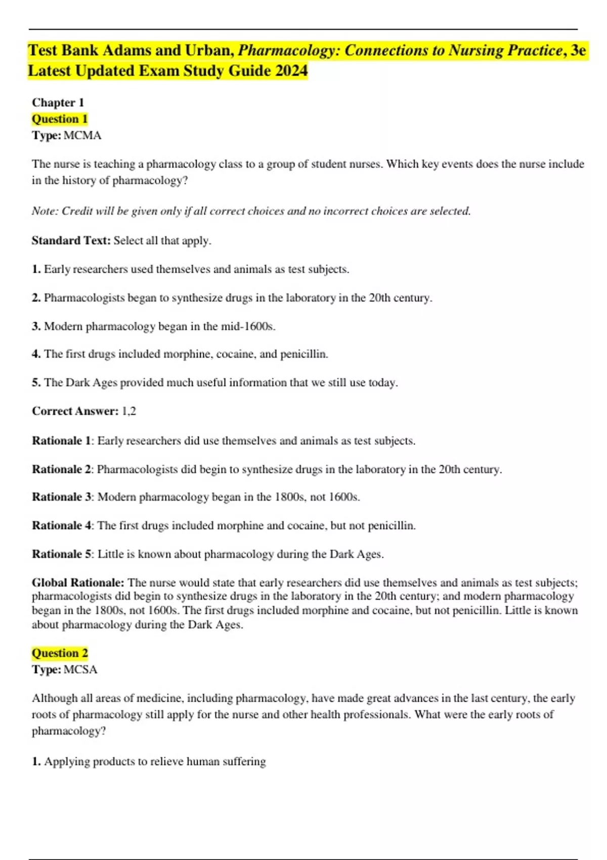 ,Test Bank Adams and Urban, Pharmacology: Connections to Nursing Practice, 3e