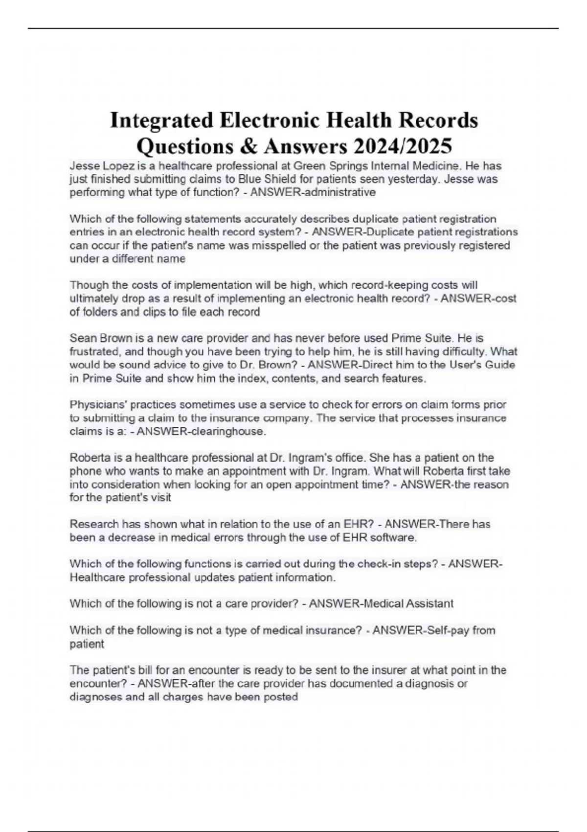 Integrated Electronic Health Records Questions & Answers 2024/2025 Jesse Lopez is a healthcare professional at Green Springs Internal Medicine. He has just finished submitting claims to Blue Shield for patients seen yesterday. Jesse was performing what type of function? - ANSWER-administrative Which of the following statements accurately describes duplicate patient registration entries in an electronic health record system? - ANSWER-Duplicate patient registrations can occur if the patient's name was misspelled or the patient was previously registered under a different name Though the costs of implementation will be high, which record-keeping costs will ultimately drop as a result of implementing an electronic health record? - ANSWER-cost of folders and clips to file each record Sean Brown is a new care provider and has never before used Prime Suite. He is frustrated, and though you have been trying to help him, he is still having difficulty. What would be sound advice to give to Dr. Brown? - ANSWER-Direct him to the User's Guide in Prime Suite and show him the index, contents, and search features. Physicians' practices sometimes use a service to check for errors on claim forms prior to submitting a claim to the insurance company. The service that processes insurance claims is a: - ANSWER-clearinghouse. Roberta is a healthcare professional at Dr. Ingram's office. She has a patient on the phone who wants to make an appointment with Dr. Ingram. What will Roberta first take into consideration when looking for an open appointment time? - ANSWER-the reason for the patient's visit Research has shown what in relation to the use of an EHR? - ANSWER-There has been a decrease in medical errors through the use of EHR software. Which of the following functions is carried out during the check-in steps? - ANSWER-Healthcare professional updates patient information. Which of the following is not a care provider? - ANSWER-Medical Assistant Which of the following is not a type of medical insurance? - ANSWER-Self-pay from patient The patient's bill for an encounter is ready to be sent to the insurer at what point in the encounter? - ANSWER-after the care provider has documented a diagnosis or diagnoses and all charges have been posted The feature in Prime Suite that guides the user on how specific functions or applications work is known as - ANSWER-Help. n a physician's practice, the documentation of a patient's office visit is often referred to as a - ANSWER-progress note. Joyce Burke is a healthcare professional working at Greenway Medical. She is responsible for compiling insurance claims and checking them for completion. Which area of the office does Joyce most likely work in? - ANSWER-business office Prime Suite uses a single _________________ to store administrative and clinical data on each patient. - ANSWER-database Which of the following EHR applications may be more beneficial and efficient for the patient? - ANSWER-ePrescribing Of the following, which does not need to be sent to an insurance company on the CMS-1500 claim form? - ANSWER-history of present illness During the history of present illness, the healthcare professional asks Ron Albertson for his preferred pharmacy. The healthcare professional then enters the information into Prime Suite. After the care provider has examined and diagnosed Mr. Albertson, he prescribes Amoxicillin and electronically sends the prescription to Mr. Albertson's chosen pharmacy without having to enter any additional information into the ePrescribe module. This is an example of - ANSWER-interoperability. A care provider is dictating a progress note into speech recognition while the patient is being seen. This dictation is occurring - ANSWER-at the point of care. Dr. Evans' office has computerized the following functions: appointment scheduling, charge capture, collections, and reporting. These are all found in which type of software? - ANSWER-practice management The steps listed below are carried out by which staff during an office visit? Patient arrives for visit → Update patient information → Check in and collect co-pay → Start patient tracking - ANSWER-registration/front-desk staff Christine Simmons arrived for her appointment with Dr. Shumaker 20 minutes ago. The healthcare professional has just left the room after taking Christine's vital signs, weightand a brief history of present illness. What will be the next step in Christine's flow through the overall process? - ANSWER-The care provider will see the patient. Prime Suite is what kind of computer software? - ANSWER-practice management and electronic health records (EHR) Of the following, which contributes to the high cost of electronic health records for the software service provider? - ANSWER-research and development costs You are a healthcare professional at Greensburg Medical Center and you have just shown a patient, Mrs. Clark, to the check-out desk, where the billing coordinator had just taken the encounter form (superbill) for the visit. Dr. Daniels came to the window and stated that Mrs. Clark left the exam room before receiving her flu shot. What will occur in this case? - ANSWER-Mrs. Clark will be taken back to the exam room; she will be given the shot by the healthcare professional, who will document it in Mrs. Clark's record and will then update the encounter form to reflect the charges for the flu shot; at that point, Mrs. Clark will return to the check-out desk. Of the following, which is an advantage of adopting an electronic health record? - ANSWER-the potential for interoperability with other computerized systems within the practice or hospital Of the following, which is not an application of an EHR system? - ANSWER-capture of insurance policy number A unique identifier that is required on claim forms and identifies the care provider or group practice submitting the claim is the - ANSWER-National Provider Identifier number. A zip code would be an example of _______________ data. - ANS