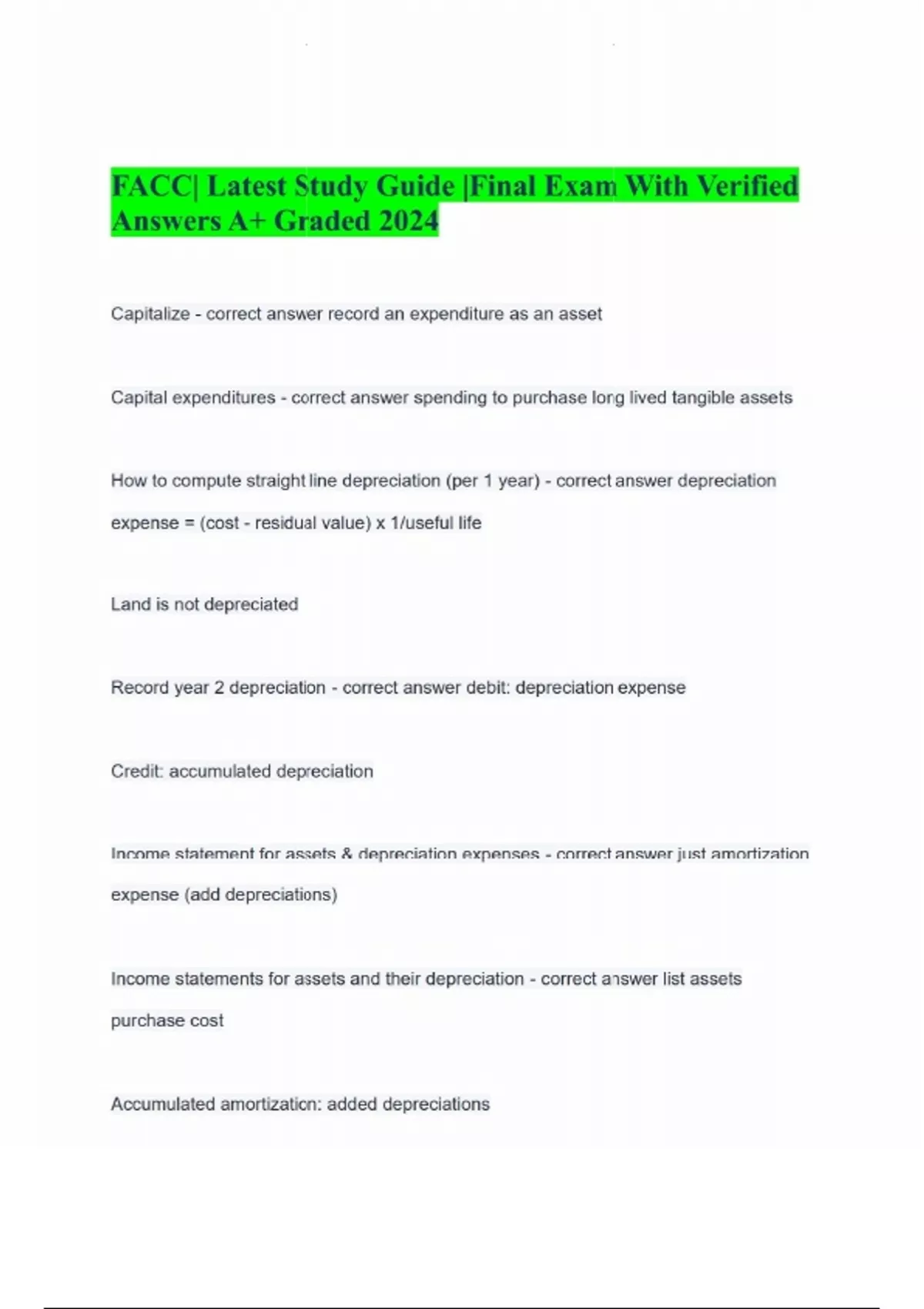 FACC| Latest Study Guide |Final Exam With Verified Answers A+ Graded 2024 Capitalize - correct answer record an expenditure as an asset Capital expenditures - correct answer spending to purchase long lived tangible assets How to compute straight line depreciation (per 1 year) - correct answer depreciation expense = (cost - residual value) x 1/useful life Land is not depreciated Record year 2 depreciation - correct answer debit: depreciation expense Credit: accumulated depreciation Income statement for assets & depreciation expenses - correct answer just amortization expense (add depreciations) Income statements for assets and their depreciation - correct answer list assets purchase cost Accumulated amortization: added depreciations