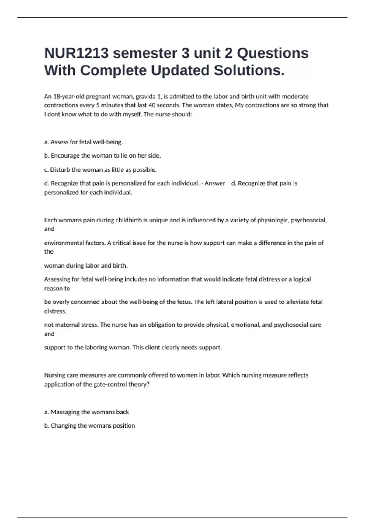 An 18-year-old pregnant woman, gravida 1, is admitted to the labor and birth unit with moderate contractions every 5 minutes that last 40 seconds. The woman states, My contractions are so strong that I dont know what to do with myself. The nurse should: a. Assess for fetal well-being. b. Encourage the woman to lie on her side. c. Disturb the woman as little as possible. d. Recognize that pain is personalized for each individual. - Answer d. Recognize that pain is personalized for each individual. Each womans pain during childbirth is unique and is influenced by a variety of physiologic, psychosocial, and environmental factors. A critical issue for the nurse is how support can make a difference in the pain of the woman during labor and birth. Assessing for fetal well-being includes no information that would indicate fetal distress or a logical reason to be overly concerned about the well-being of the fetus. The left lateral position is used to alleviate fetal distress, not maternal stress. The nurse has an obligation to provide physical, emotional, and psychosocial care and support to the laboring woman. This client clearly needs support. Nursing care measures are commonly offered to women in labor. Which nursing measure reflects application of the gate-control theory? a. Massaging the womans back b. Changing the womans position