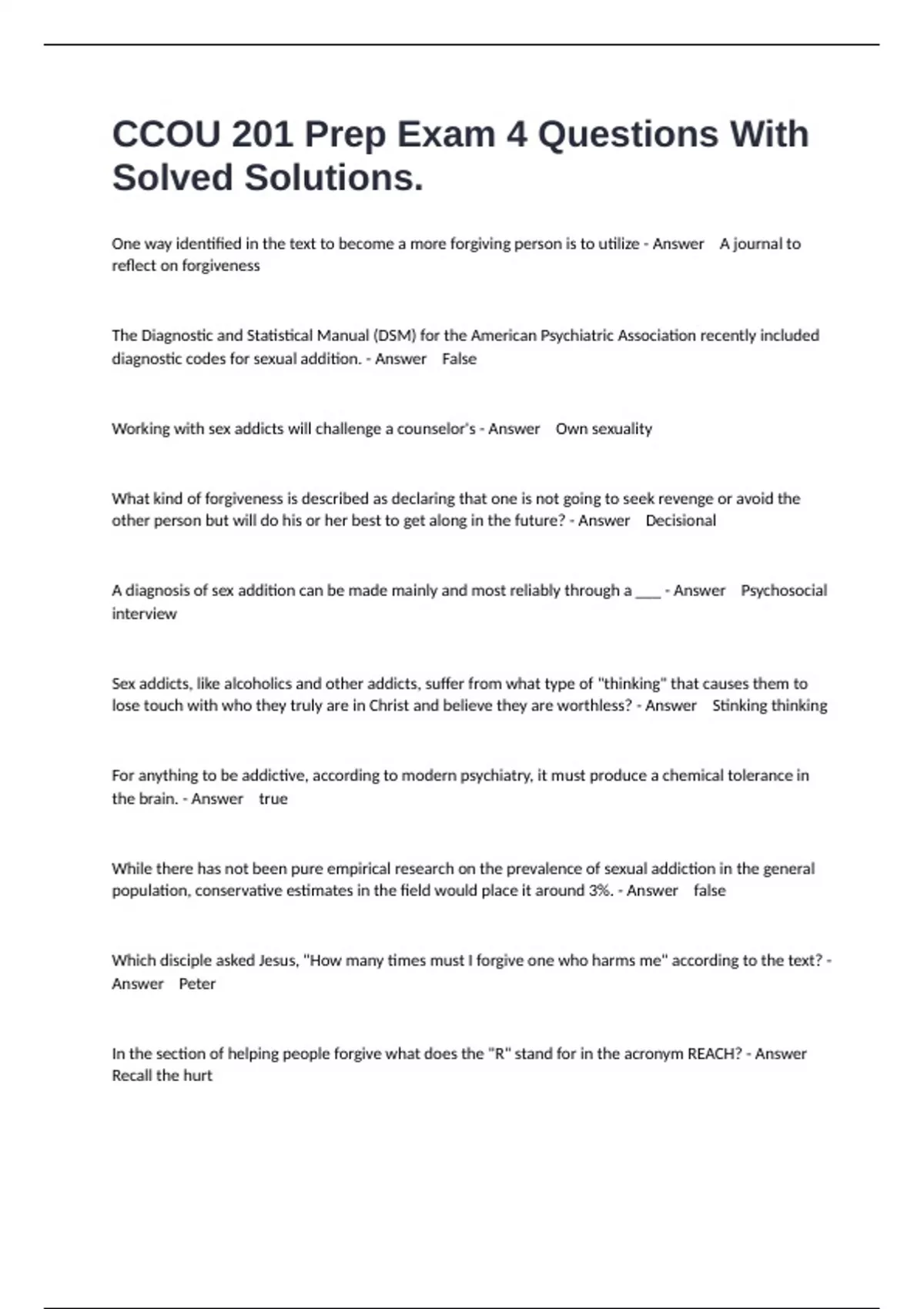 One way identified in the text to become a more forgiving person is to utilize - Answer A journal to reflect on forgiveness The Diagnostic and Statistical Manual (DSM) for the American Psychiatric Association recently included diagnostic codes for sexual addition. - Answer False Working with sex addicts will challenge a counselor's - Answer Own sexuality What kind of forgiveness is described as declaring that one is not going to seek revenge or avoid the other person but will do his or her best to get along in the future? - Answer Decisional A diagnosis of sex addition can be made mainly and most reliably through a ___ - Answer Psychosocial interview Sex addicts, like alcoholics and other addicts, suffer from what type of "thinking" that causes them to lose touch with who they truly are in Christ and believe they are worthless? - Answer Stinking thinking For anything to be addictive, according to modern psychiatry, it must produce a chemical tolerance in the brain. - Answer true While there has not been pure empirical research on the prevalence of sexual addiction in the general population, conservative estimates in the field would place it around 3%. - Answer false Which disciple asked Jesus, "How many times must I forgive one who harms me" according to the text? - Answer Peter In the section of helping people forgive what does the "R" stand for in the acronym REACH? - Answer Recall the hurt