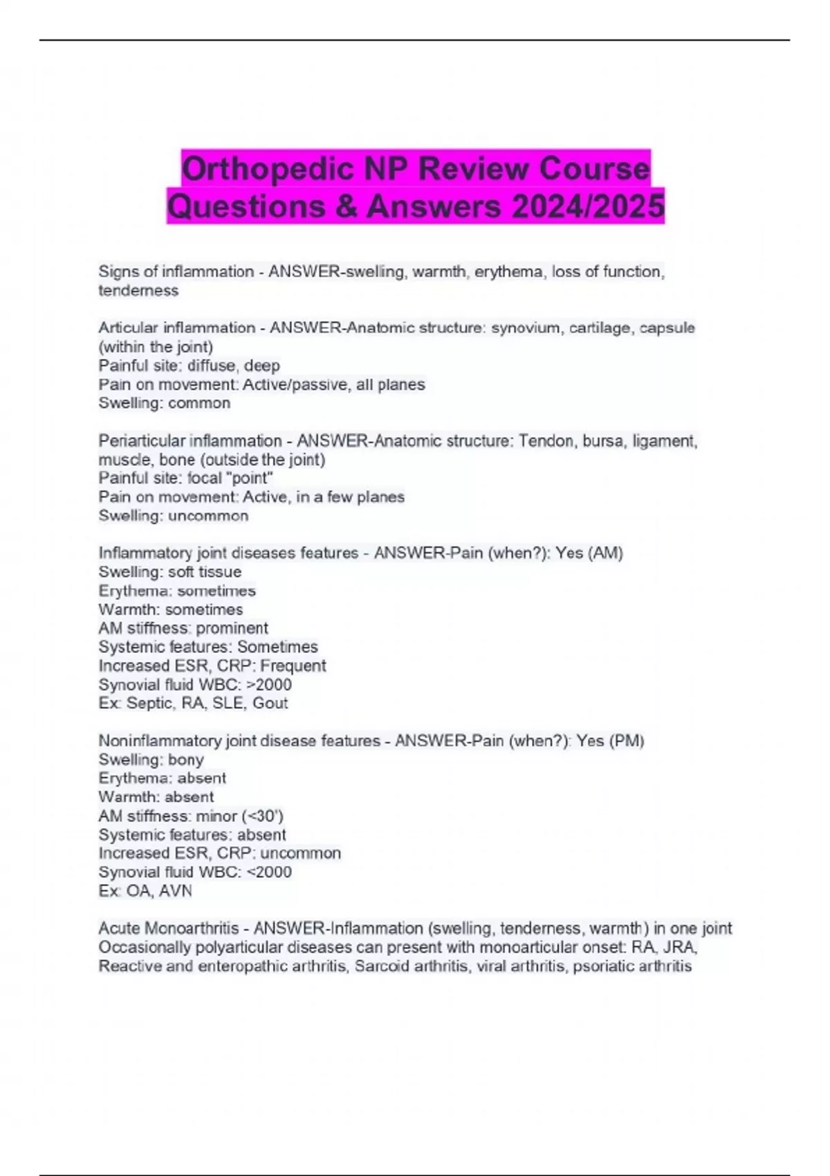 Orthopedic NP Review Course Questions & Answers 2024/2025 Signs of inflammation - ANSWER-swelling, warmth, erythema, loss of function, tenderness Articular inflammation - ANSWER-Anatomic structure: synovium, cartilage, capsule (within the joint) Painful site: diffuse, deep Pain on movement: Active/passive, all planes Swelling: common Periarticular inflammation - ANSWER-Anatomic structure: Tendon, bursa, ligament, muscle, bone (outside the joint) Painful site: focal "point" Pain on movement: Active, in a few planes Swelling: uncommon Inflammatory joint diseases features - ANSWER-Pain (when?): Yes (AM) Swelling: soft tissue Erythema: sometimes Warmth: sometimes AM stiffness: prominent Systemic features: Sometimes Increased ESR, CRP: Frequent Synovial fluid WBC: >2000 Ex: Septic, RA, SLE, Gout Noninflammatory joint disease features - ANSWER-Pain (when?): Yes (PM) Swelling: bony Erythema: absent Warmth: absent AM stiffness: minor (<30') Systemic features: absent Increased ESR, CRP: uncommon Synovial fluid WBC: <2000 Ex: OA, AVN Acute Monoarthritis - ANSWER-Inflammation (swelling, tenderness, warmth) in one joint Occasionally polyarticular diseases can present with monoarticular onset: RA, JRA, Reactive and enteropathic arthritis, Sarcoid arthritis, viral arthritis, psoriatic arthritis Acute Monoarthritic Etiology - ANSWER-THE MOST CRITICAL DIAGNOSIS TO CONSIDER: INFECTION! Septic Crystal deposition (gout, pseudogout) Traumatic (fracture, internal derangement) Other (hemarthrosis, osteonecrosis, presentation of polyarticular disorders) Questions to ask: History helps in Differential Dx - ANSWER-Pain come suddenly, minutes? - fracture Over several hours or 1-2 days? - infectious, crystals, inflammatory arthropathy. History of IV drug abuse or a recent infection? - septic joint. Previous similar attacks? - crystals or inflammatory arthritis. Prolonged courses of steroids? - infection or osteonecrosis of the bone. Indications for arthrocentesis - ANSWER-The single most useful diagnostic study in initial evaluation of monoarthritis: SYNOVIAL FLUID ANALYSIS -Suspicion of infection -Suspicion of crystal-induced arthritis -Suspicion of hemarthrosis -Differentiating inflammatory from noninflammatory arthritis Tests to perform on synovial fluid - ANSWER--Low threshold for doing Gram stain and cultures. -Total leukocyte count/differential: inflammatory vs. non-inflammatory. -Polarized microscopy to look for crystals Synovial fluid analysis - ANSWER--Less viscous seen with inflammation -Cloudy - infection, WBC, Crystals -Reddish = blood -Glucose - significantly lower w/infection and inflammation -Protein increased with infection -LDH - increased with infection, RA, gout -Uric acid = gout Septic Joint - ANSWER--Most articular infections - a single joint -15-20% cases polyarticular -Most common sites: knee, hip, shoulder -20% patients afebrile -Joint pain is moderate to severe -Joints visibly swollen, warm, often red -Comorbidities: RA, DM, SLE, cancer, etc Septic Joint - Nongonococcal - ANSWER--80-90% monoarticular -Most develop from hematogenous spread -Most common: Gram positive aerobes (80%); majority with Staph aureus (60%); gram negative 18% Septic Joint: Gonococcal - ANSWER--Most common cause of septic arthritis -Often preceded by disseminated gonococcemia -Sexually active individual, 5-7 days h/o fever, chills, skin lesions, migratory arthralgias and tenosynovitis -> persistent monoarthritis -Women often menstruating or pregnant -Genitourinary disease often asymptomatic Gout - ANSWER--Caused by monosodium urate crystals -Most common type of inflammatory monoarthritis -Typically: first MTP joint, ankle, midfoot, knee -Pain very severe; cannot stand bed sheet -May be with fever and mimic infection -The cutaneous erythema may extend beyond the joint and resemble bacterial cellulitis Risk factors for gout - ANSWER--Primary gout: obesity, HLD, DM, HTN, atherosclerosis -Secondary gout: alcoholism, drug therapy (diuretics, cytotoxic), myeloproliferative disorders, chronic renal failure Gout presenting s/s - ANSWER--Systemic: fever rare but may occur, chills and malaise -MS: Acute onset of monoarticular joint pain. First MTP most common. Usually affected in 90% of patients with gout. Other joints include knees, foot and ankle. Less common in upper extremities (Postulated that decreased solubility of MSU at lower temps of peripheral structures such as toe and ear) -Skin: warmth, erythema and tenseness of skin overlaying joint. May have pruritic and desquamation. -GU: Renal colic with renal calculi formation in patients with hyperuricemia Gout Dx - ANSWER-Uric Acid (limited value as majority of hyperuricemic pts will never develop gout; levels may be normal during acute attack) CBC (mild leukocytosis in acute attacks, but may be higher than 25,000/mm) ESR (mild elevation or may be 2-3 x normal) 24 hr urine uric acid (only useful in pts being considered for uricosuric therapy or if cause of marked hyperuricemia needs investigation) Trial of colchicine (Positive response may occur in other types of arthritis to include pseudogout Gout treatment goals - ANSWER--Gout can be treated without complications -Therapeutic goals include: terminating attacks; providing control of pain and inflammation; preventing future attacks; preventing complications such as renal stones, tophi, and destructive arthropathy Acute gout attack treatment - ANSWER--NSAIDS most commonly used, all work the same, Indocin most commonly used, remember to use with caution with CAD, GI bleed, RF -Indocin 50 mg PO BID-TID for 2-3 days and then taper -Ibuprofen 400mg PO q4-6hr max 3.2g/day -Ketorolac 60 mg IM or 30mg IV x1 dose in pts <65 (30mg IM or 15mg IV in single dose in pts >65 yo, or w pts who are renally impaired -Continue meds until pain and inflammation have resolved for 48 hr Colchicine for acute gout - ANSWER--Inhibits microtubule aggregation which disrupts chemotaxis and phagocytosis -Inhibits crystal-induced production of chemotacti