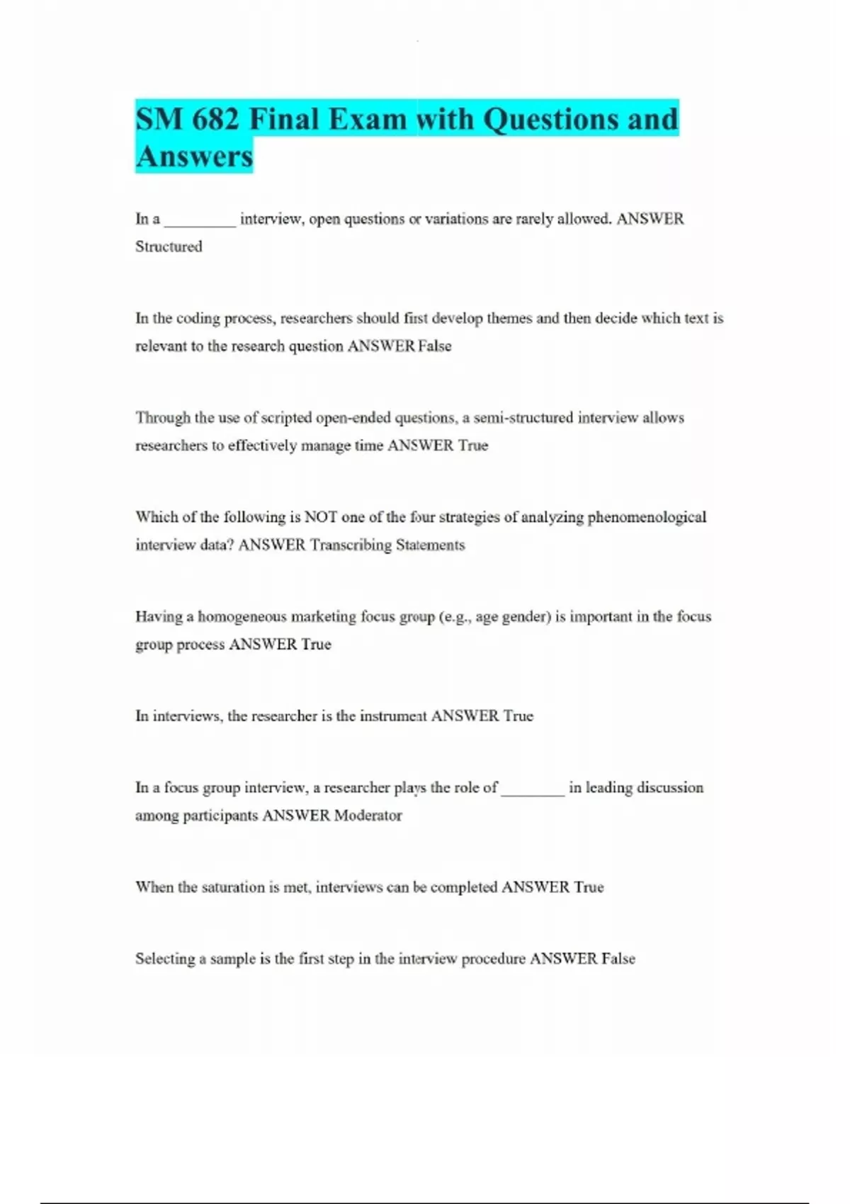 SM 682 Final Exam with Questions and Answers In a _________ interview, open questions or variations are rarely allowed. ANSWER Structured In the coding process, researchers should first develop themes and then decide which text is relevant to the research question ANSWER False Through the use of scripted open-ended questions, a semi-structured interview allows researchers to effectively manage time ANSWER True Which of the following is NOT one of the four strategies of analyzing phenomenological interview data? ANSWER Transcribing Statements Having a homogeneous marketing focus group (e.g., age gender) is important in the focus group process ANSWER True In interviews, the researcher is the instrument ANSWER True In a focus group interview, a researcher plays the role of ________ in leading discussion among participants ANSWER Moderator When the saturation is met, interviews can be completed ANSWER True Selecting a sample is the first step in the interview procedure ANSWER False