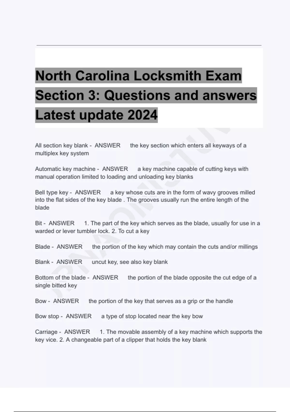 North Carolina Locksmith Exam Section 3: Questions and answers Latest update 2024