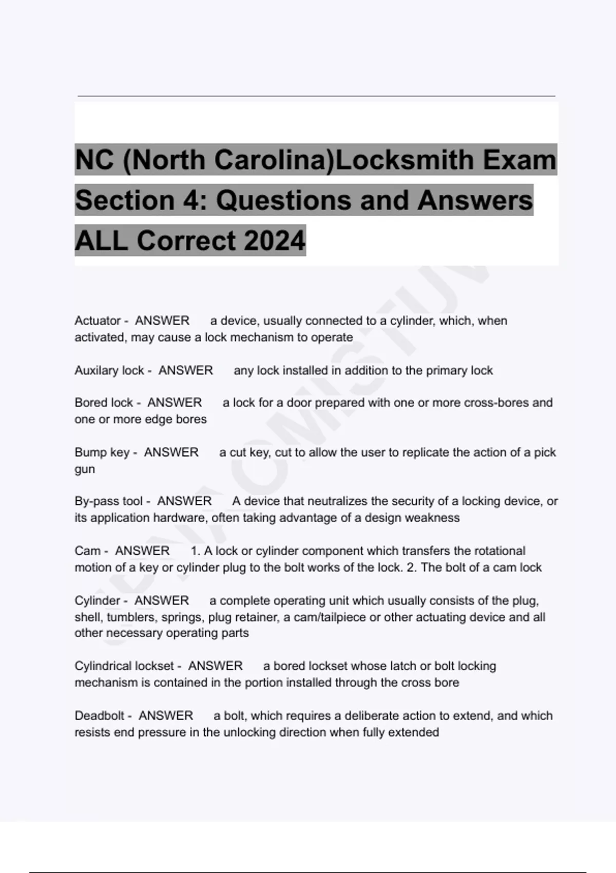 NC (North Carolina)Locksmith Exam Section 4: Questions and Answers ALL Correct 2024