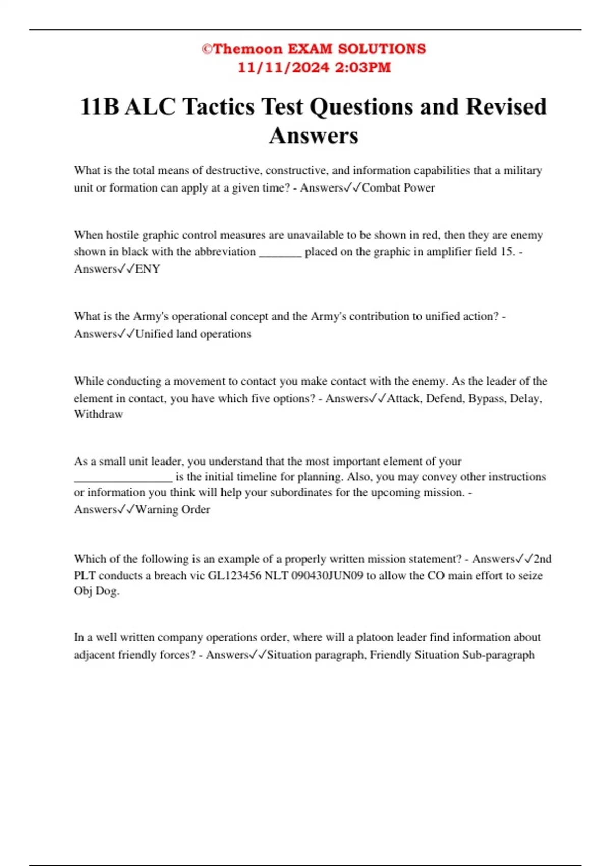 11B ALC Tactics Test Questions and Revised Answers What is the total means of destructive, constructive, and information capabilities that a military unit or formation can apply at a given time? - AnswersCombat Power When hostile graphic control measures are unavailable to be shown in red, then they are enemy shown in black with the abbreviation _______ placed on the graphic in amplifier field 15. - AnswersENY What is the Army's operational concept and the Army's contribution to unified action? - AnswersUnified land operations While conducting a movement to contact you make contact with the enemy. As the leader of the element in contact, you have which five options? - AnswersAttack, Defend, Bypass, Delay, Withdraw As a small unit leader, you understand that the most important element of your ________________ is the initial timeline for planning. Also, you may convey other instructions or information you think will help your subordinates for the upcoming mission. - AnswersWarning Order Which of the following is an example of a properly written mission statement? - Answers2nd PLT conducts a breach vic GL123456 NLT 090430JUN09 to allow the CO main effort to seize Obj Dog. In a well written company operations order, where will a platoon leader find information about adjacent friendly forces? - AnswersSituation paragraph, Friendly Situation Sub-paragraph You are planning to conduct a raid. You know raids are normally conducted in five phases. What are the five phases of conducting a raid? - AnswersApproach the OBJ, Isolate the OBJ, Set conditions for asslt element, Assault the objective, Tactical movement away from the obj Which of the following are the 4 types of Offensive Tasks? - AnswersMovement to contact, Attack, Pursuit, Exploitation (MAPE) You have just completed your mission analysis, course of action development, and course of action selection. These actions take place in which step of the TLP process? - AnswersMake a tentative plan Military symbols fall into two categories, framed and unframed. What symbols fall under unframed? - AnswersControl Measures (7) Preparation, security, disruption, mass and concentration, flexibility, maneuver, and operations in-depth are the 7 characteristics of - AnswersDefensive operations While you are occupying and preparing your defensive position. What is critical during the occupation to ensure the platoon avoids detection and maintains combat power for the actual defense? - AnswersOperational security What are the characteristics of offensive operations? - AnswersSurprise, Tempo, Audacity, Concentration Surprise, Tempo, Audacity, Concentration - AnswersSecurity, support, assault Which of the following best describes Key Terrain? - AnswersKey terrain affords a marked advantage to whoever seizes, retains or controls it The two key pieces of information in any mission statement are ________ & _________. - AnswersTask & Purpose