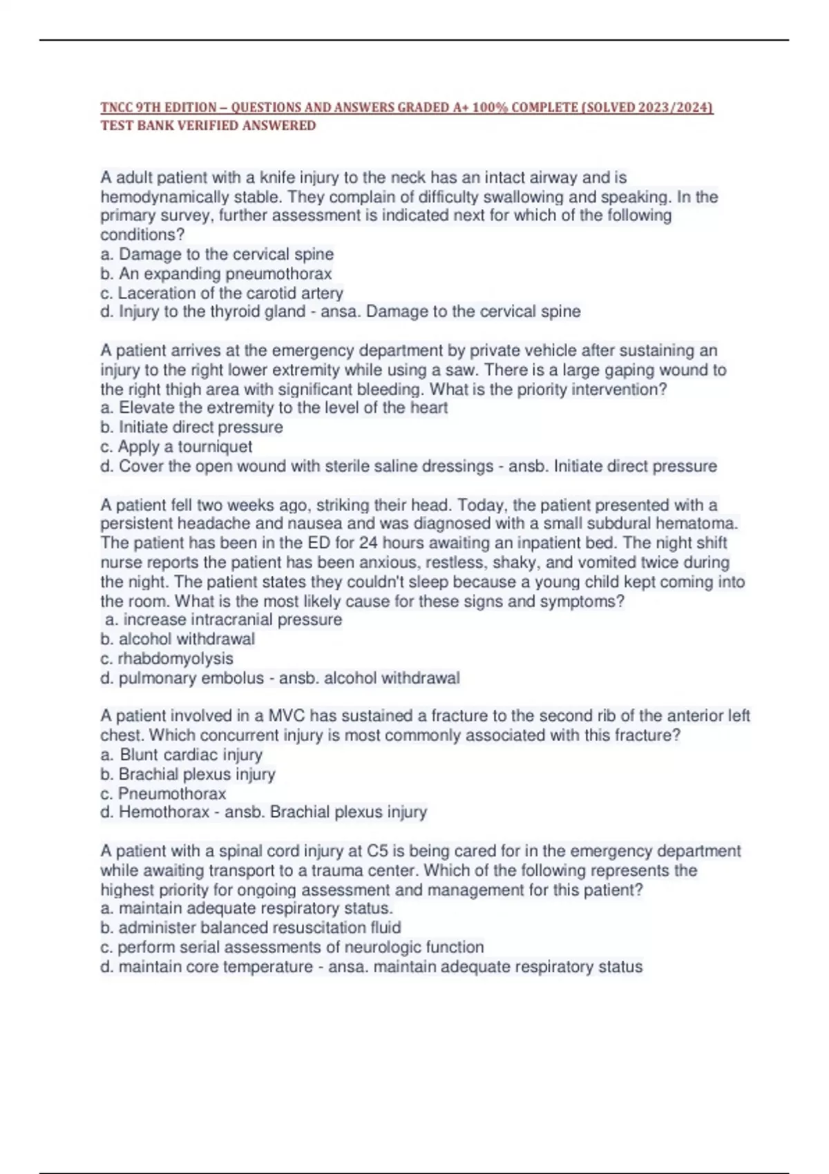 ,TNCC 9TH EDITION – QUESTIONS AND ANSWERS GRADED A+ 100% COMPLETE (SOLVED 2023/2024)