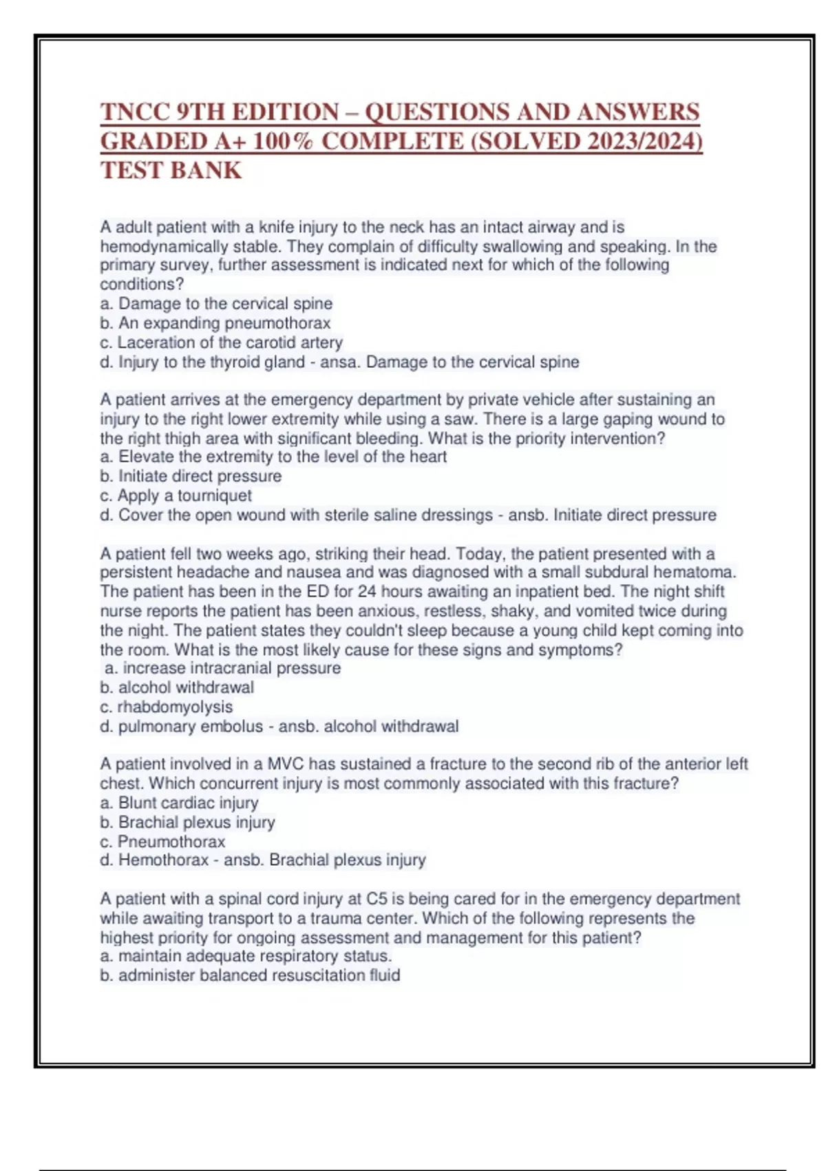 , TNCC 9TH EDITION – QUESTIONS AND ANSWERS
