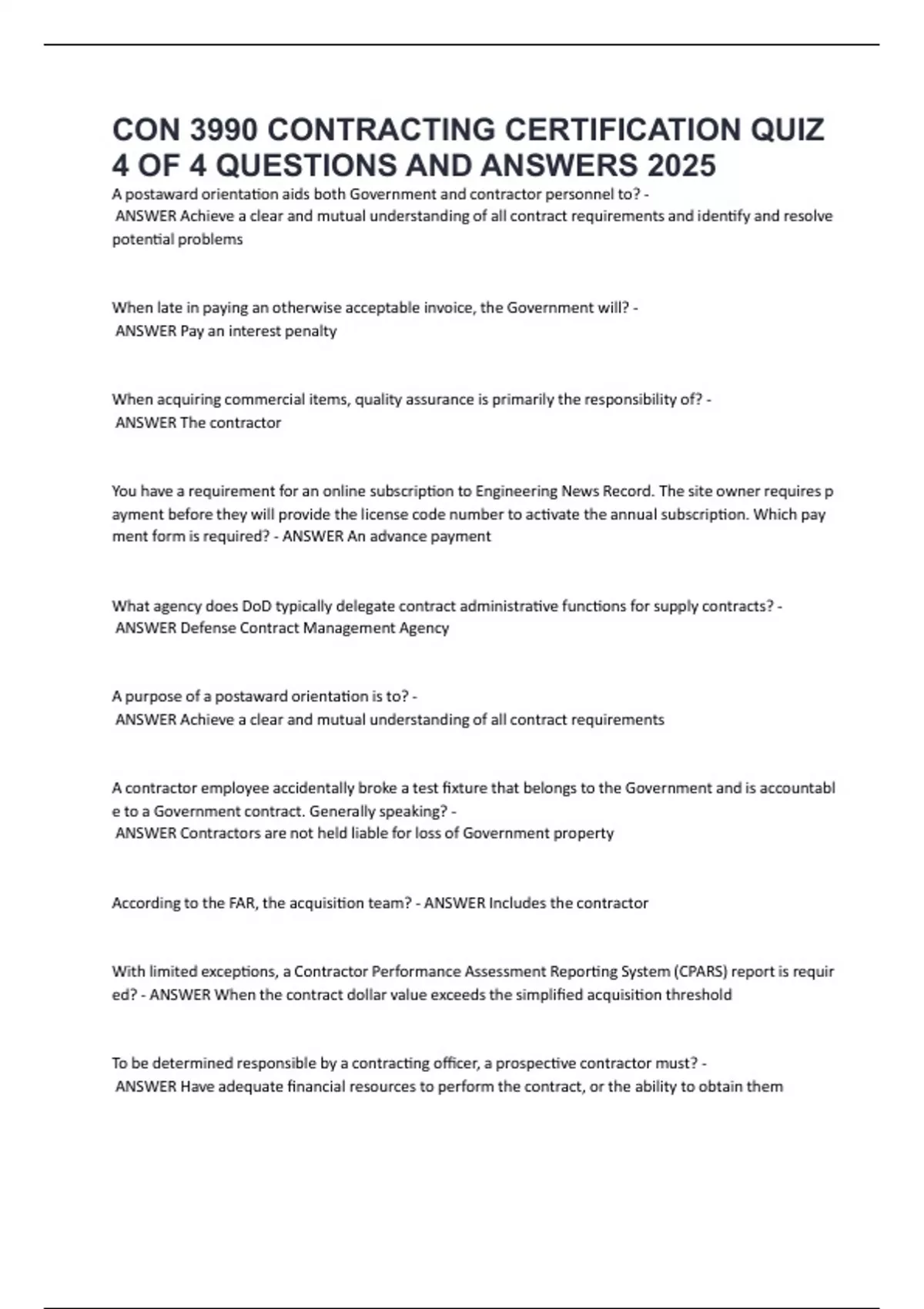 CON 3990 CONTRACTING CERTIFICATION QUIZ 4 OF 4 QUESTIONS AND ANSWERS 2025