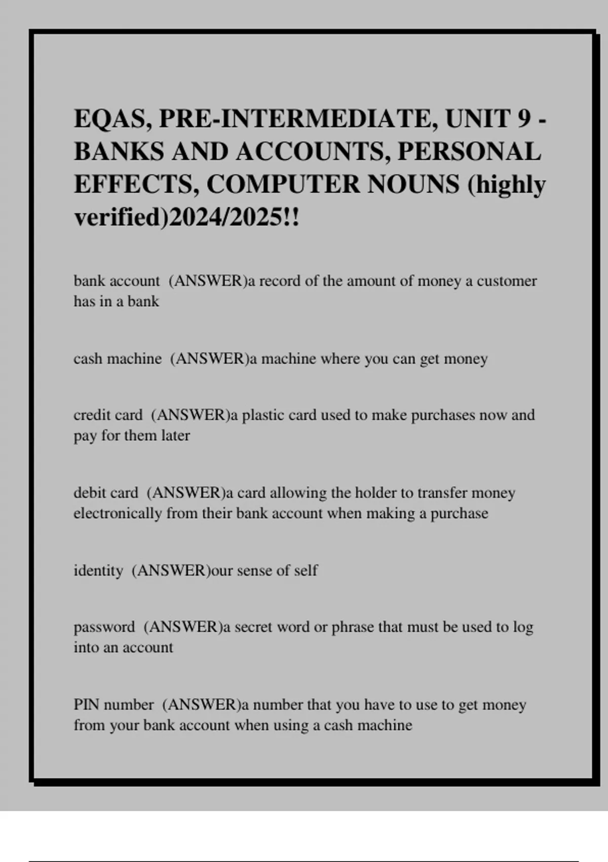 EQAS, PRE-INTERMEDIATE, UNIT 9 - BANKS AND ACCOUNTS, PERSONAL EFFECTS, COMPUTER NOUNS (highly verified)2024/2025!!