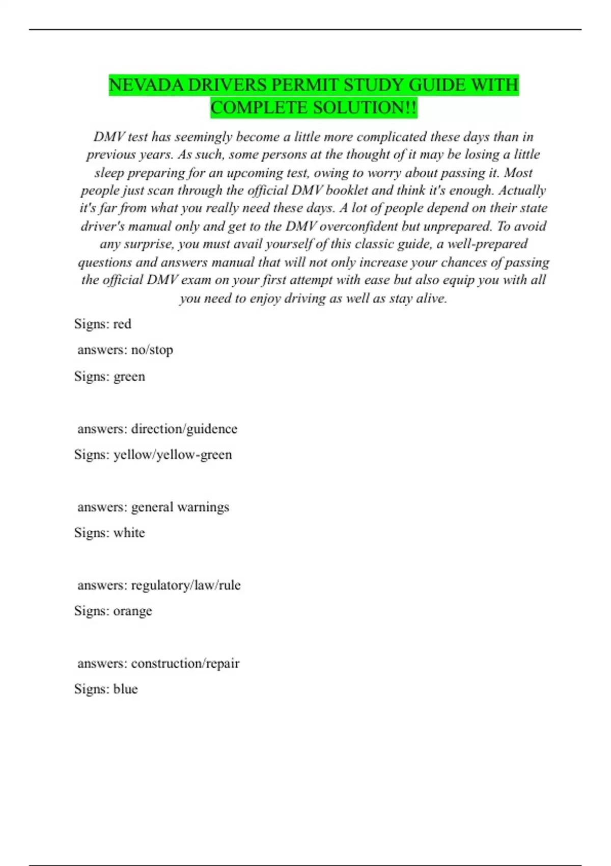 NEVADA DRIVERS PERMIT STUDY GUIDE WITH COMPLETE SOLUTION!!