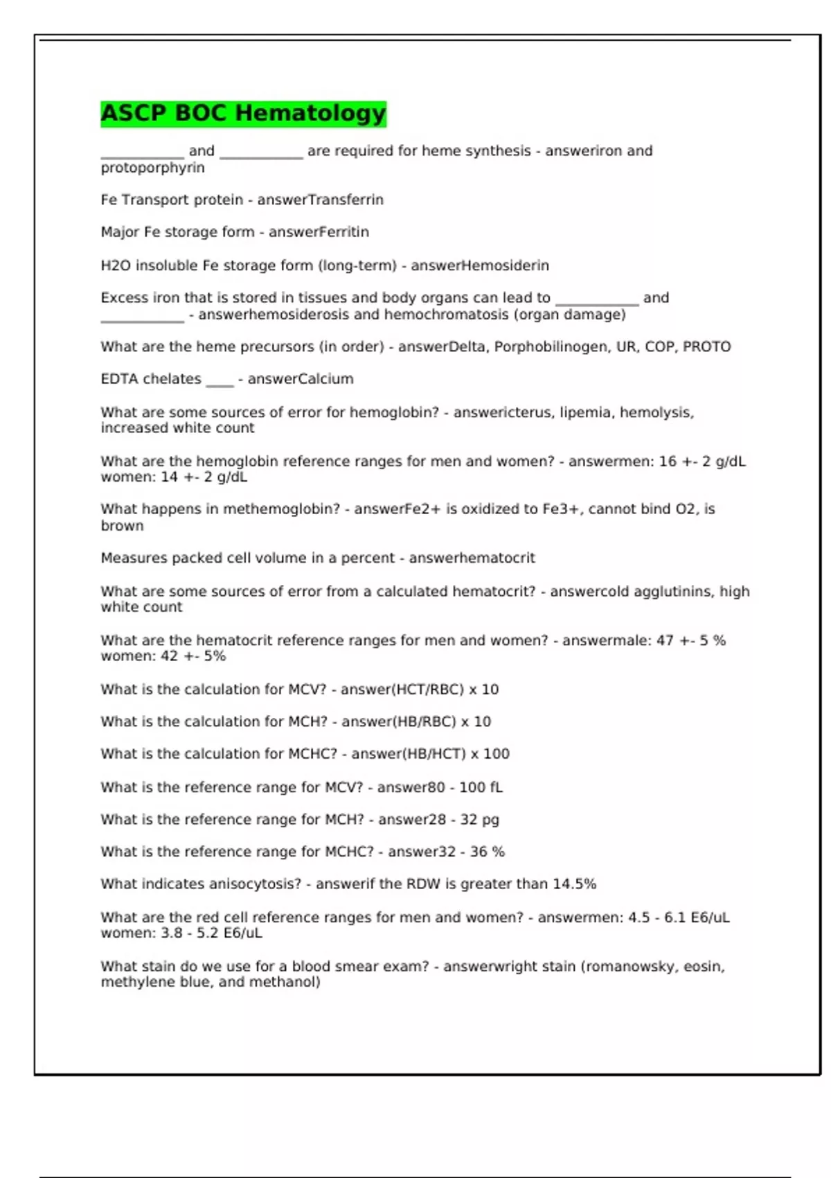____________ and ____________ are required for heme synthesis - answeriron and protoporphyrin Fe Transport protein - answerTransferrin Major Fe storage form - answerFerritin H2O insoluble Fe storage form (long-term) - answerHemosiderin Excess iron that is stored in tissues and body organs can lead to ____________ and ____________ - answerhemosiderosis and hemochromatosis (organ damage) What are the heme precursors (in order) - answerDelta, Porphobilinogen, UR, COP, PROTO EDTA chelates ____ - answerCalcium What are some sources of error for hemoglobin? - answericterus, lipemia, hemolysis, increased white count What are the hemoglobin reference ranges for men and women? - answermen: 16 +- 2 g/dL women: 14 +- 2 g/dL What happens in methemoglobin? - answerFe2+ is oxidized to Fe3+, cannot bind O2, is brown Measures packed cell volume in a percent - answerhematocrit What are some sources of error from a calculated hematocrit? - answercold agglutinins, high white count What are the hematocrit reference ranges for men and women? - answermale: 47 +- 5 % women: 42 +- 5% What is the calculation for MCV? - answer(HCT/RBC) x 10 What is the calculation for MCH? - answer(HB/RBC) x 10 What is the calculation for MCHC? - answer(HB/HCT) x 100 What is the reference range for MCV? - answer80 - 100 fL What is the reference range for MCH? - answer28 - 32 pg What is the reference range for MCHC? - answer32 - 36 % What indicates anisocytosis? - answerif the RDW is greater than 14.5% What are the red cell reference ranges for men and women? - answermen: 4.5 - 6.1 E6/uL women: 3.8 - 5.2 E6/uL What stain do we use for a blood smear exam? - answerwright stain (romanowsky, eosin, methylene blue, and methanol) What white cell would be increased? Bacterial infections - answerneutrophils What white cell would be increased? viral infections - answerlymphocytes What white cell would be increased? Tb, syphillis, malignancies - answermonocytes What white cell would be increased? Allergies, parasites - answereosinophils What white cell would be increased? immediate hypersensitivity - answerbasophils Hypersegmented neutrophils are associated with - answermegaloblastic anemia, B12 and folate deficiency Hyposegmented neutrophils are associated with - answerpelger huet anomaly (AML, AIDS) Toxic granulation and vacuoles are associated with - answerbacterial infection, burns, chemo Dhole bodies are associated with - answerbacterial infections, burns, may hegglin anomaly Variant lymphs are associated with - answerIM, viral infection What is the calculation for a corrected white count when nucleolar reds are seen? - answer(WBC x 100/ 100 +nrbc) What RBC inclusion is NOT seen with wright stain? - answerHeinz bodies Where is blood produced at 1 month? - answeryolk sac Where is blood produced at 4 months? - answerspleen and liver Where is blood produced at 8 months? - answerbone marrow What hemoglobin chains make up A2? - answeralpha, delta What hemoglobin chins make up A? - answeralpha, beta What hemoglobin chains make up F? - answeralpha, gamma What hemoglobin chains make up portland? - answerzeta, gamma
