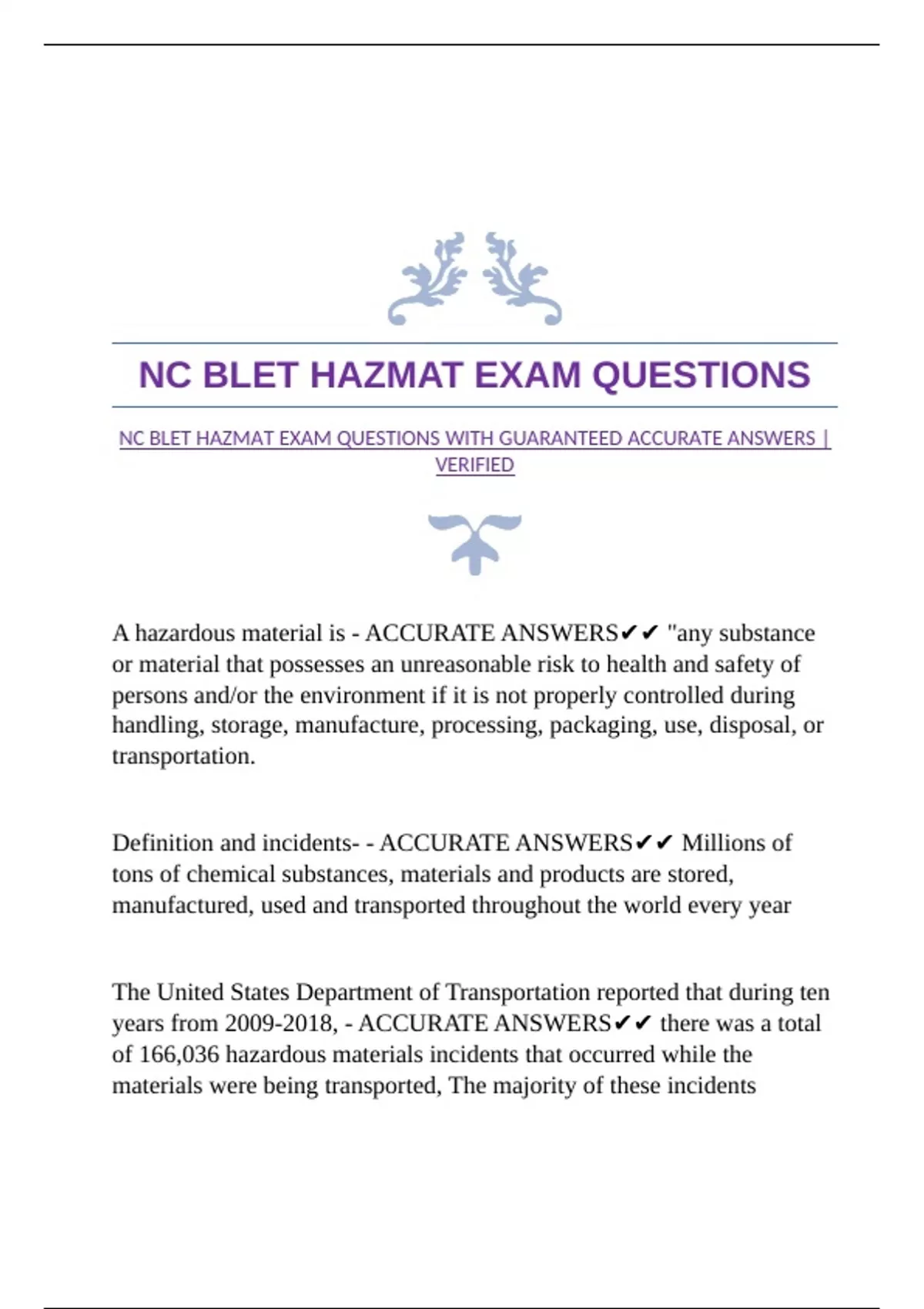 NC BLET HAZMAT EXAM QUESTIONS WITH GUARANTEED ACCURATE ANSWERS |