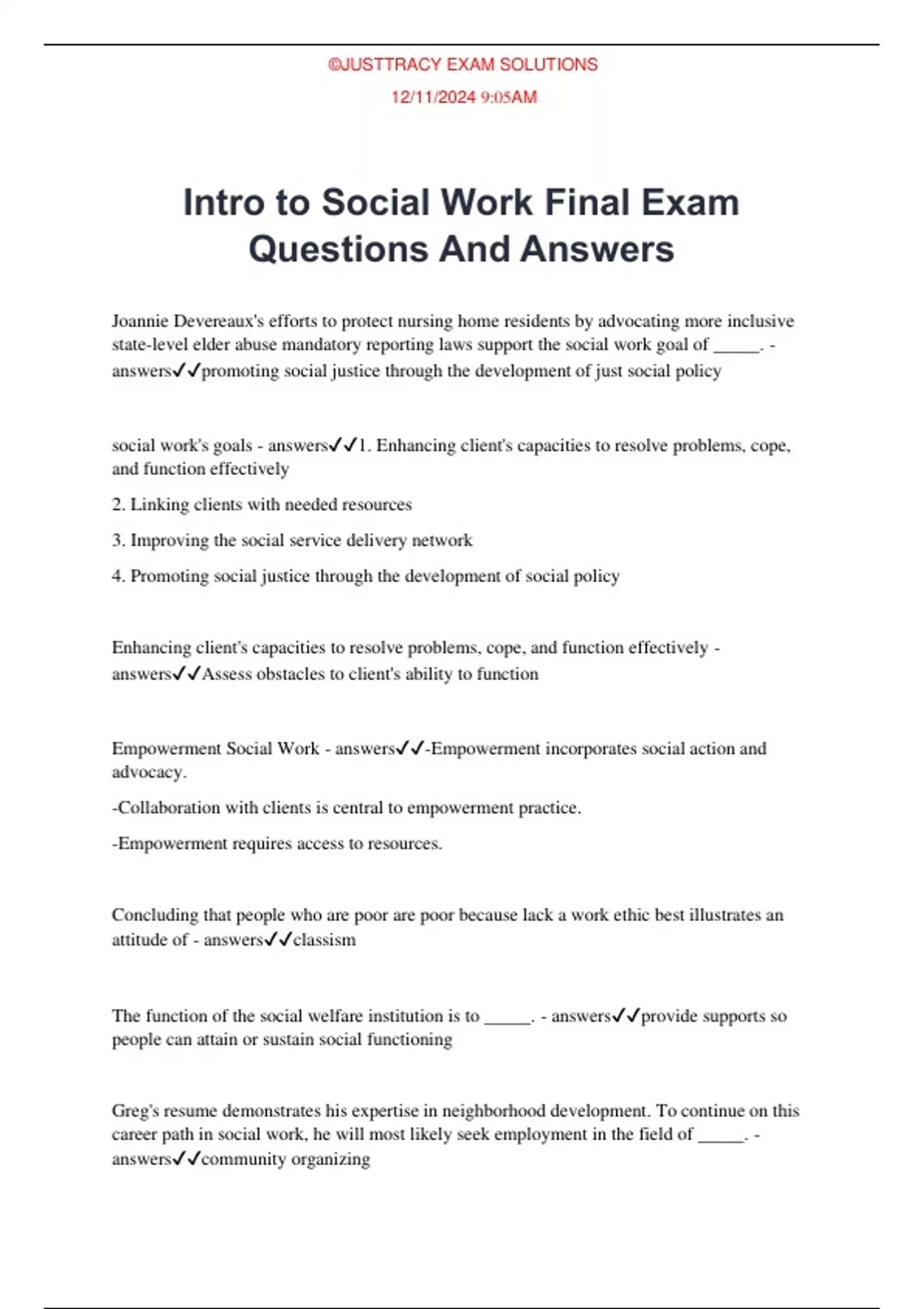 Intro to Social Work Final Exam Questions And Answers Joannie Devereaux's efforts to protect nursing home residents by advocating more inclusive state-level elder abuse mandatory reporting laws support the social work goal of _____. - answerspromoting social justice through the development of just social policy social work's goals - answers1. Enhancing client's capacities to resolve problems, cope, and function effectively 2. Linking clients with needed resources 3. Improving the social service delivery network 4. Promoting social justice through the development of social policy Enhancing client's capacities to resolve problems, cope, and function effectively - answersAssess obstacles to client's ability to function Empowerment Social Work - answers-Empowerment incorporates social action and advocacy. -Collaboration with clients is central to empowerment practice. -Empowerment requires access to resources. Concluding that people who are poor are poor because lack a work ethic best illustrates an attitude of - answersclassism The function of the social welfare institution is to _____. - answersprovide supports so people can attain or sustain social functioning Greg's resume demonstrates his expertise in neighborhood development. To continue on this career path in social work, he will most likely seek employment in the field of _____. - answerscommunity organizing Lien upholds the view that social welfare programs and services should be available to all persons as a citizen right. Lien's perspective reflects a(n) ______ view of social welfare. - answersinstitutional Consensus Model - answersvalues maintaining equilibrium in relationships between the society and its members. conflict model - answersFocues on power issues and hold that social problems result from inequitable distributions of power and authority. Change the power and authority in social arrangements. institutional view of social welfare - answersa view of the function of social welfare, welfare as an integrated function of a modern industrial society that provides services as a citizen's right. criticized for usurping the legitimate functions of other institutions. no stigma attached to receiving funds or services, belief that an individual's difficulties are due to cases largely beyond his or her control. residual view of social welfare - answersa view of the function of social welfare, welfare applies only when family, economic, or political structures break down. criticized as stopgap measure or "bandage approach" to the provision of services. stigma attached to receiving services or funds. Empowerment is best described as ______. - answershaving personal and sociopolitical dimensions A basic assumption of Maslow's hierarchy of needs is that _____. - answersfundamental basic needs must be met before pursuing higher-level growth needs As an empowerment-oriented social worker. Jim knows that empowerment refers to ______. - answersboth a process and an outcome Which of the following exemplifies a second generation right? - answersrights to a reasonable standard of living first gen rights - answersCivil & Political Due process Freedom of speech, religion, assembly second gen rights - answerssocial, economic, and cultural health care, standard of living, education, work, discrimination third gen rights - answerscollective rights environmental justice, humanitarian and disaster relief, economic development, self-determination, peaceful coexistence Delivered at the Baltimore Conference on Charities, Flexner's 1915 speech ______. - answersgenerated activities so social work could meet his stated criteria for achieving professional status Students enrolled in the course, "Generalist Social Work Practice," are learning about ways to build collaborative relationships with clients. These relationship-building skills are most likely associated with the outcome competency identified as _____. - answersengagement Competencies - answers1. Ethical and professional behavior 2. Diversity and difference 3. Human rights and social, economic, and environmental justice 4. practice-informed research and research-informed practice 5. policy practice 6. engagement 7. Assessment 8. Intervention 9. Evaluation